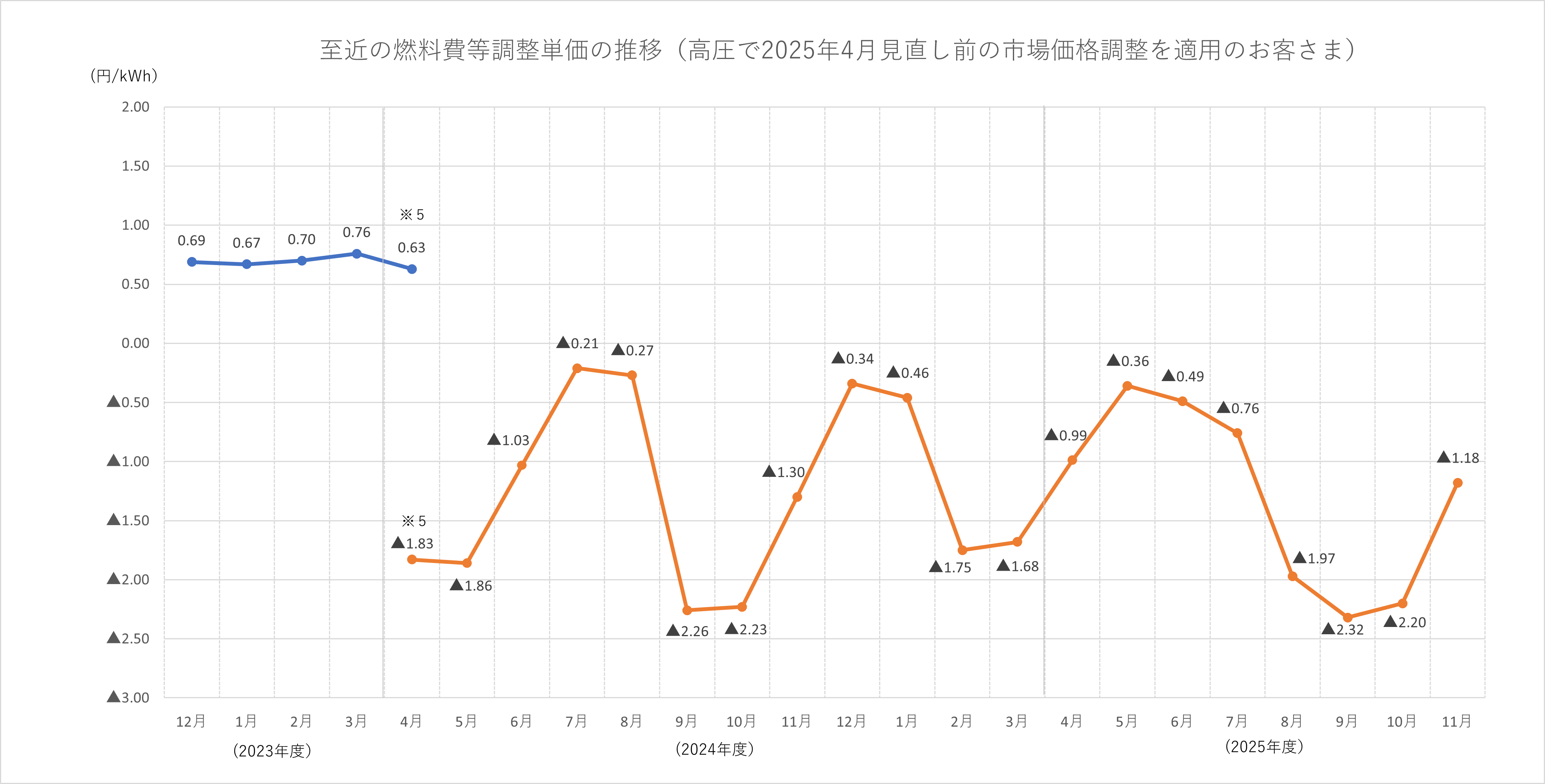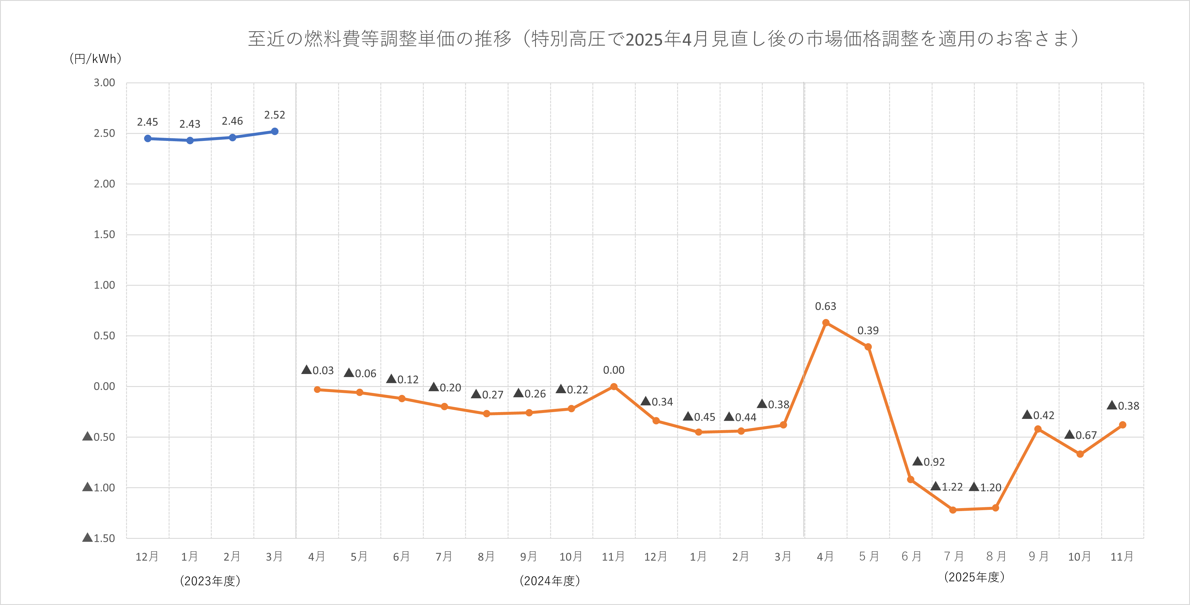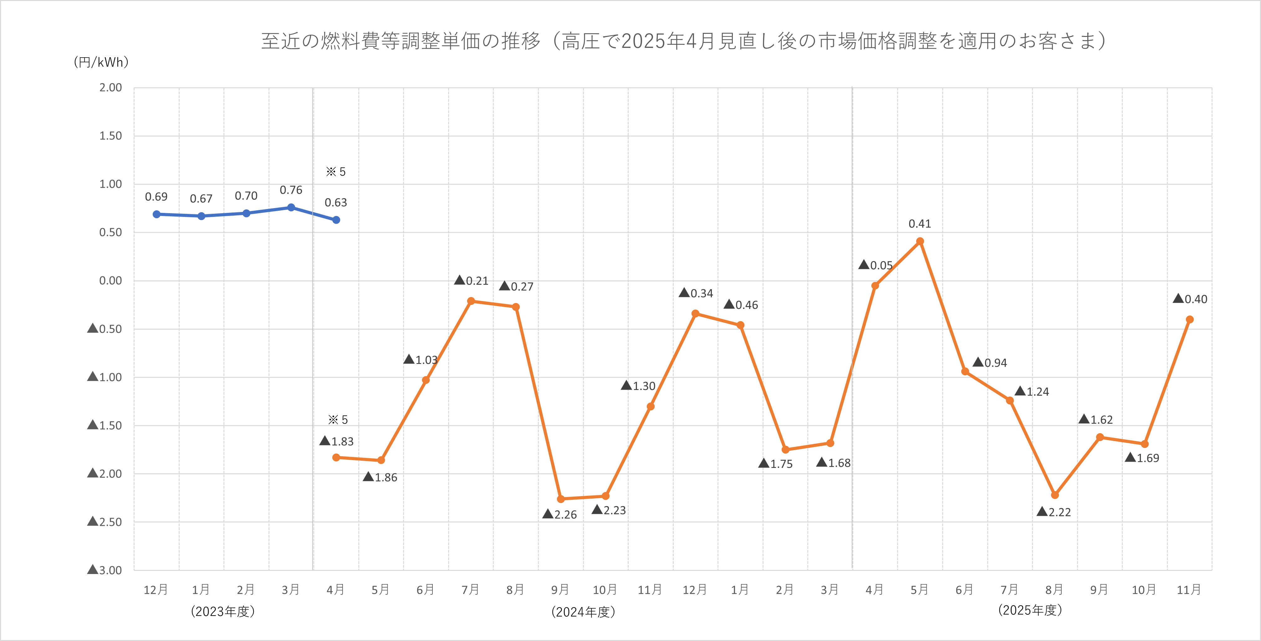 燃料費調整単価 | ▲0.04 | ▲0.06 | ▲0.12 | ▲0.20 | ▲0.28 | ▲0.28 | ▲0.24 | ▲0.25 | ▲0.35 | ▲0.44 | ▲0.43 | ▲0.36 |
