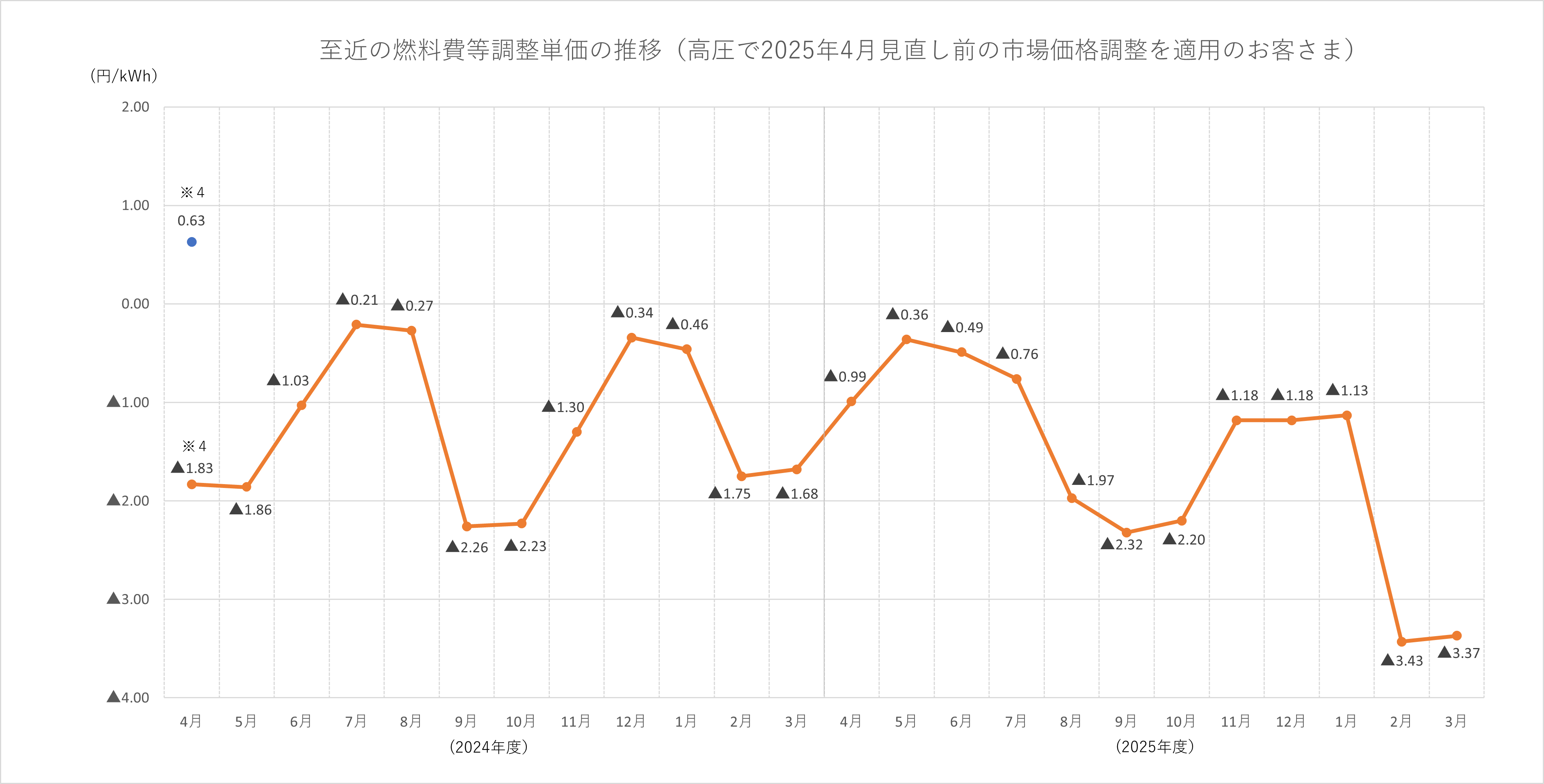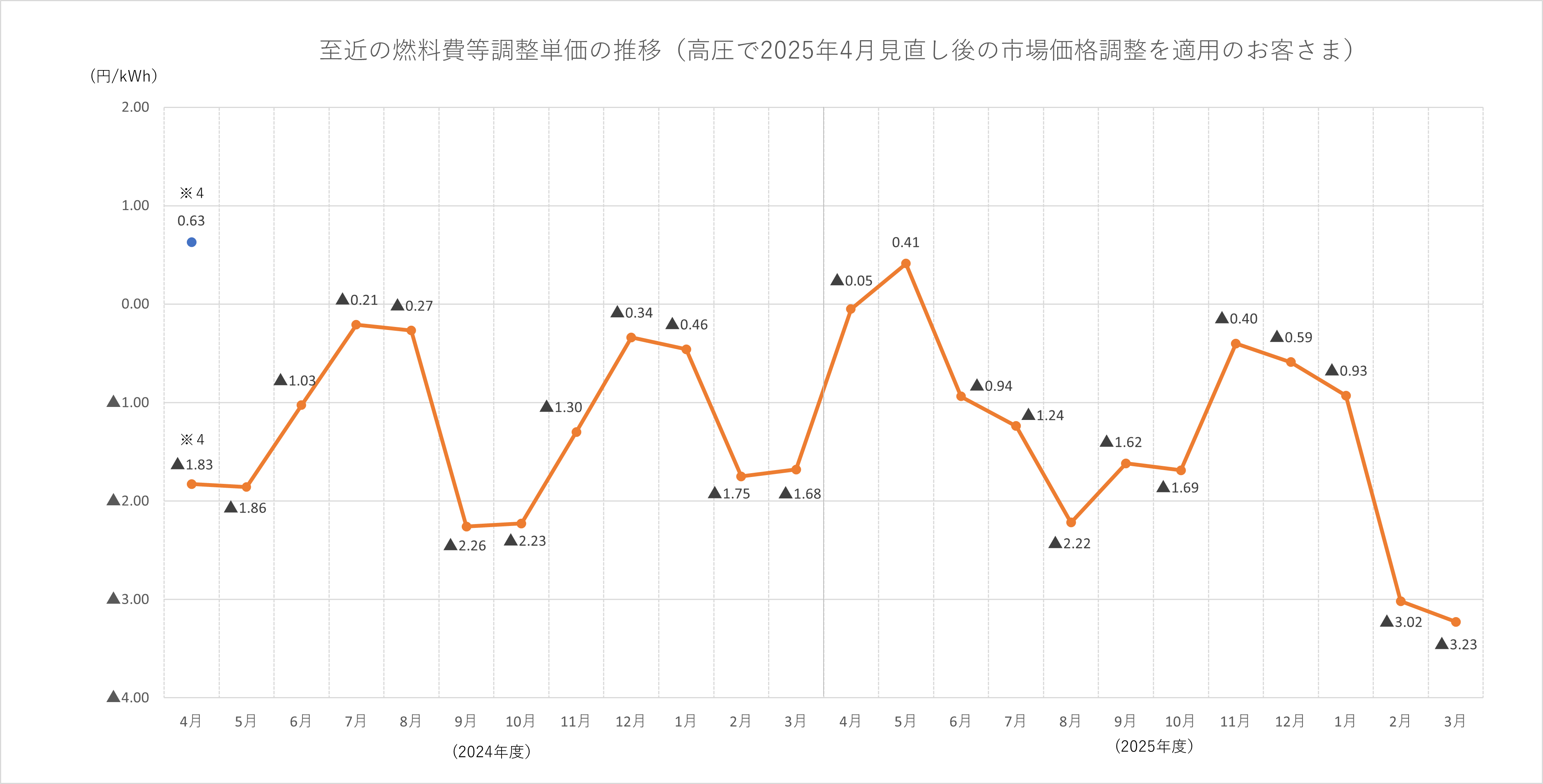 (注4)契約電力500kW以上のお客さまについては2024年4月分より、契約電力500kW未満のお客さまについては2024年5月分より、燃料費調整・市場価格調整の前提諸元の見直しをおこなっています。(2024年4月分:契約電力500kW以上 ▲1.83円/kWh、契約電力500kW未満 0.63円/kWh)