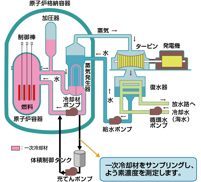 原子力発電所では、運転中、定期的に原子炉内の一次冷却材(水)の放射性よう素の濃度を測定し、燃料棒(被覆管)に微小な穴などが発生して燃料棒中の放射性物質が一次冷却材中に漏れ出していないかを確認しています。