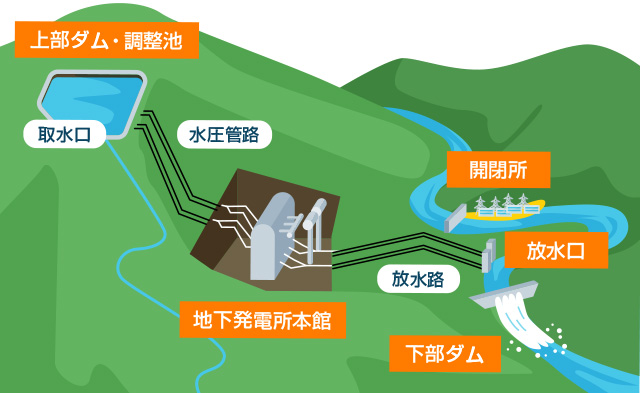 小丸川発電所は、小丸川の支流大瀬内谷川の最上流部に上部ダムを築造して上部調整池とし、小丸川中流部に下部ダムを築造して下部調整池とし、この間の有効落差約650mを約2.8kmの水路で連結し、毎秒222立方メートルの水を使い、地下に設けた発電所で最大出力120万kWの発電を行います。