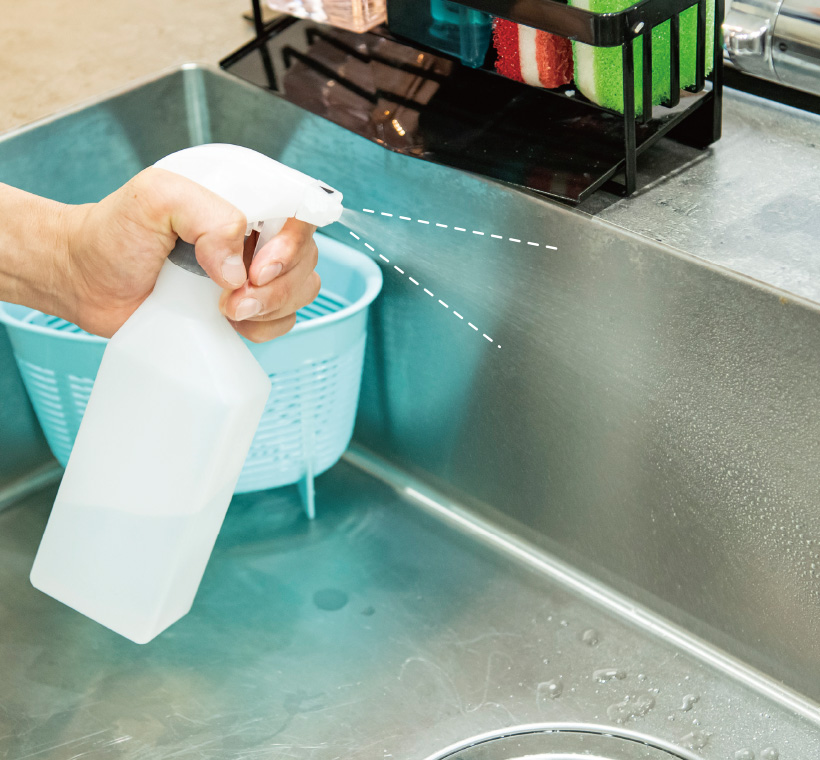 シンクのほか、水アカが溜まりやすい蛇口にシュッ。汚れが気になる箇所は、ペーパーで湿布するとより効果的です。