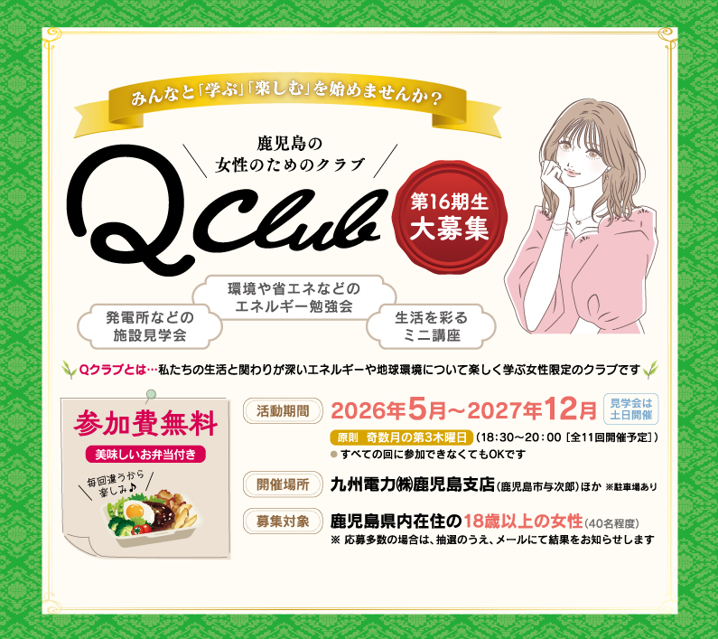エネルギーや地球環境について、勉強会や施設見学などを通じて楽しみながら学んで、暮らしに役立てることを目的に、働く女性を中心とした一般女性が対象の九州電力が主催するクラブです。