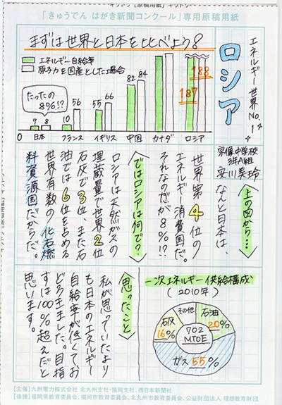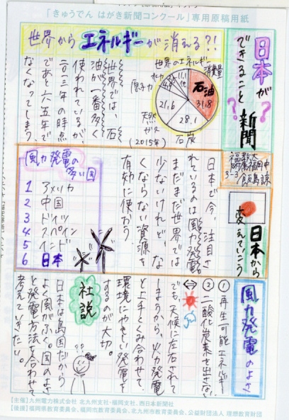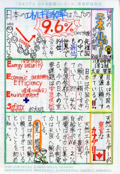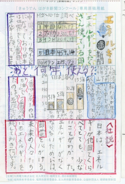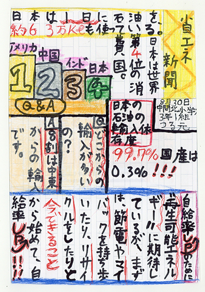 「自給率がとても低い日本」という発見を基にして①再エネを増やすことと②省エネを進めることについて詳しく調べ、図を使ってまとめているところやこれからの自分たちへの課題を述べているところが素晴らしいです。