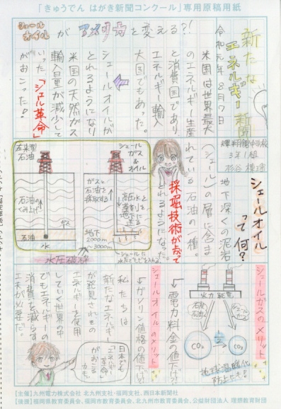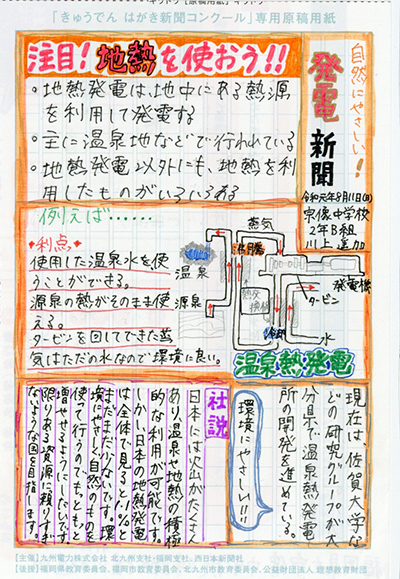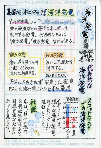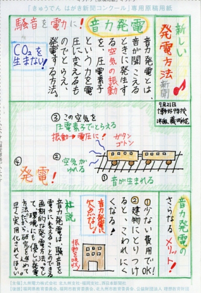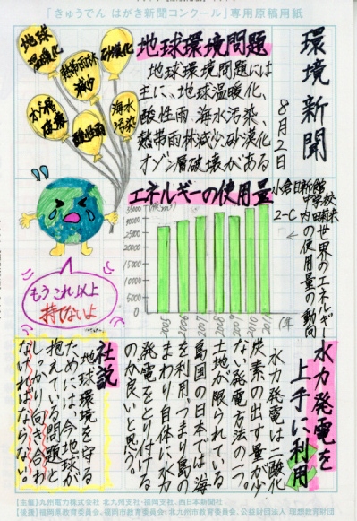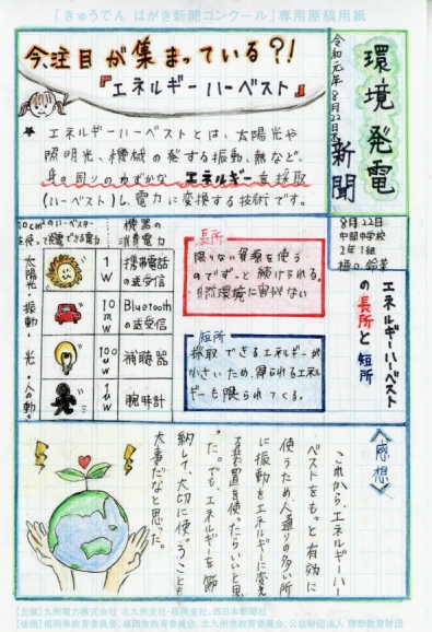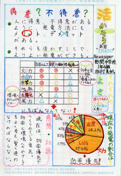 「みなさんは小水力発電という発電方法を知っていますか?」という問いから始まり、そのことについて詳しく説明をした後、実際に糸島市内の会社を取材して分かったことをまとめていることで説得力のある新聞になっています。