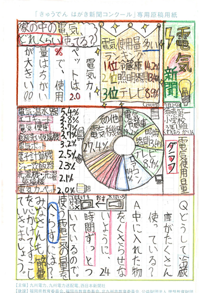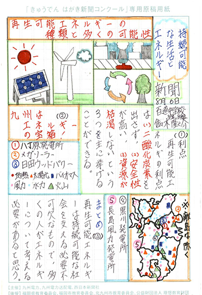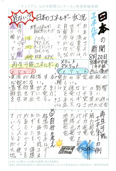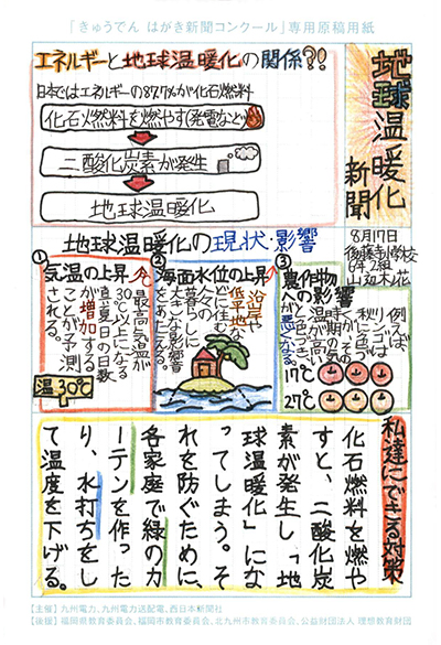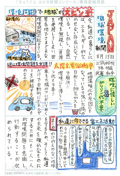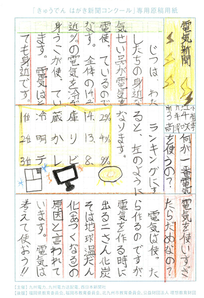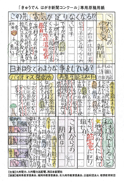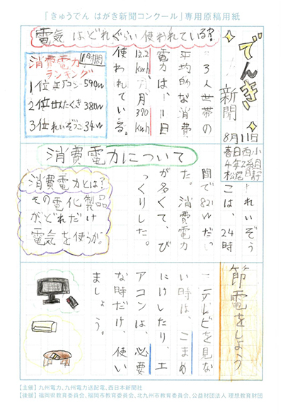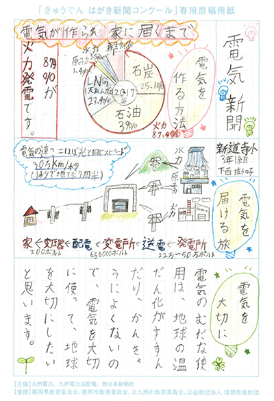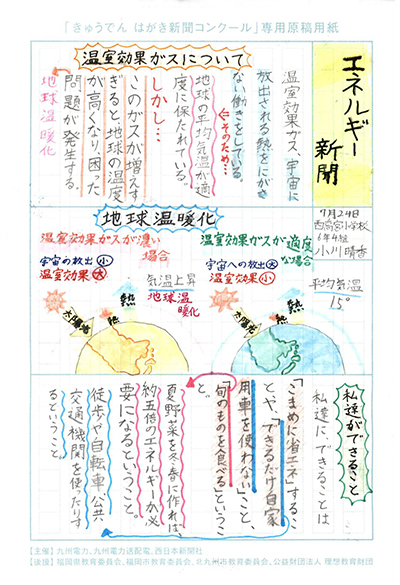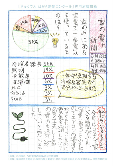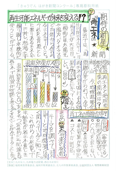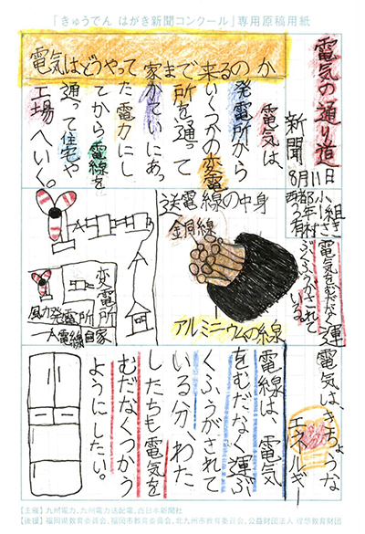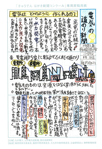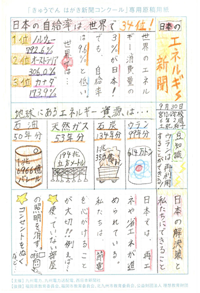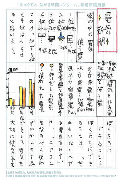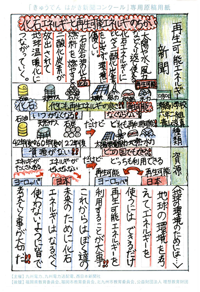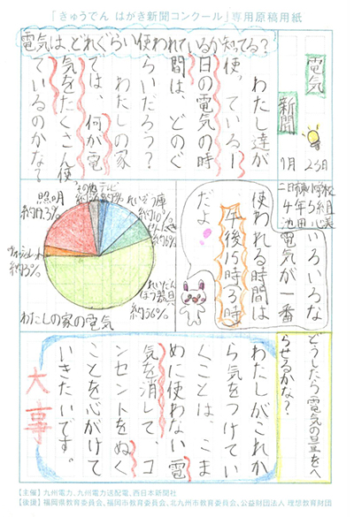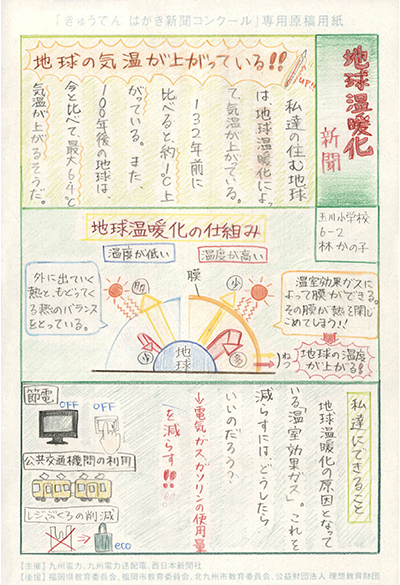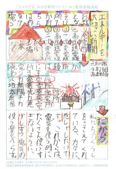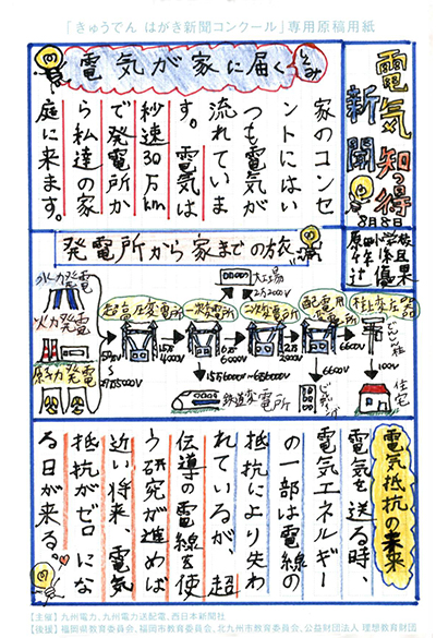 エネルギーや環境問題について関心を持ってもらおうと、九州電力と西日本新聞社が企画した「第4回きゅうでん はがき新聞コンクール」。福岡県内在住の小中学生から、自ら調べ、考えたことをまとめた力作が寄せられました。昨年を上回る4,276点の応募作品の中から選ばれた入賞作品・入賞者を紹介します。