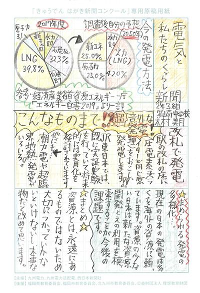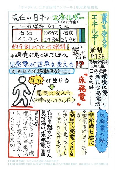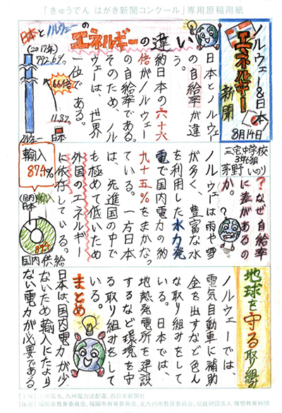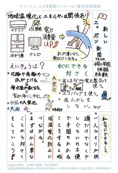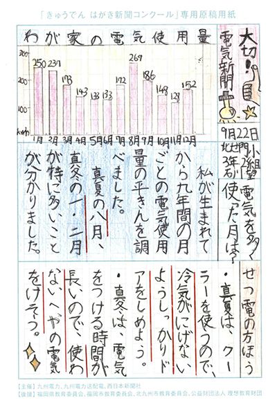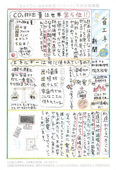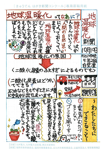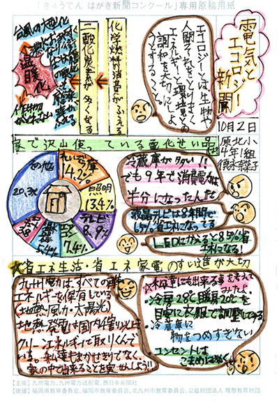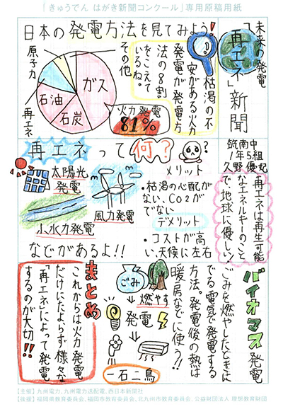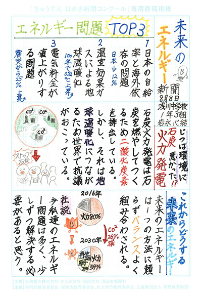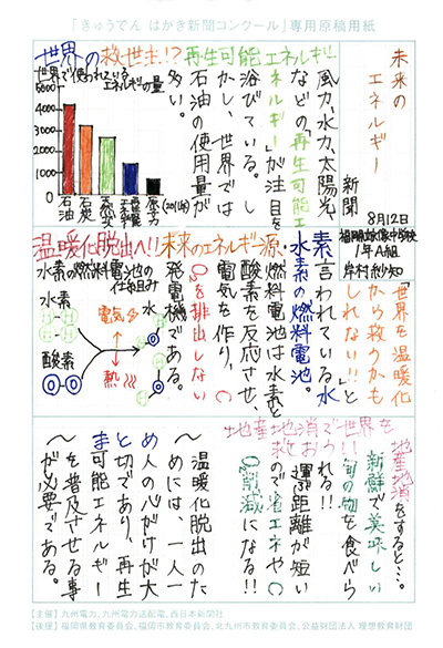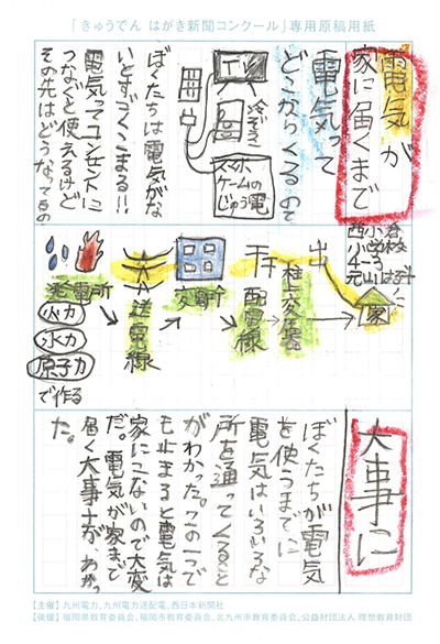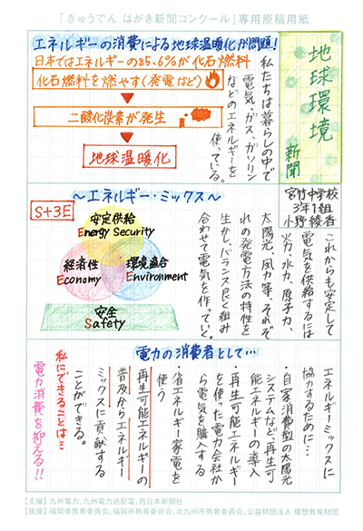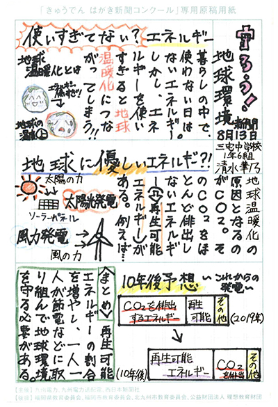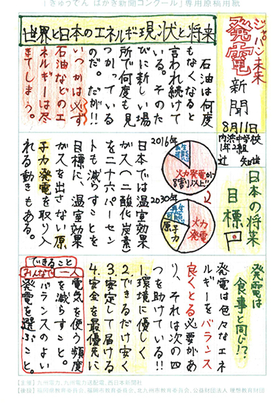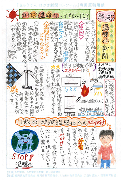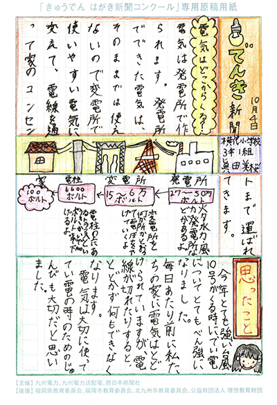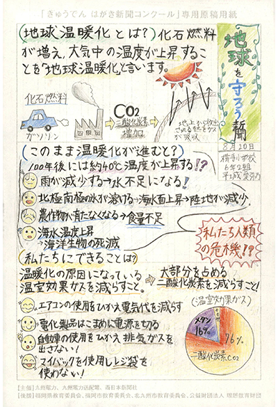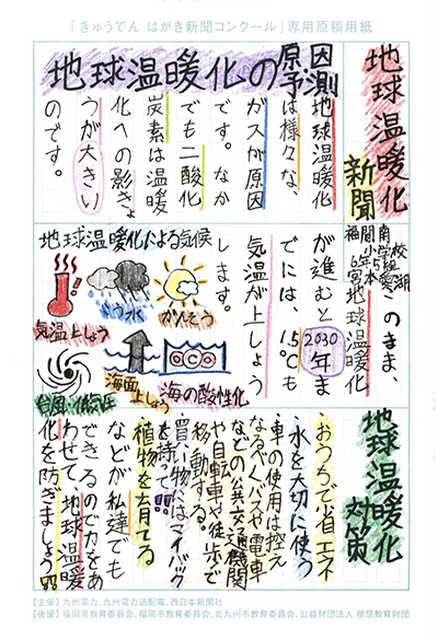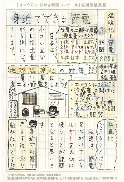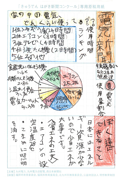 エネルギーや環境問題について関心を持ってもらおうと、九州電力と西日本新聞社が企画した「第4回きゅうでん はがき新聞コンクール」。福岡県内在住の小中学生から、自ら調べ、考えたことをまとめた力作が寄せられました。昨年を上回る4,276点の応募作品の中から選ばれた入賞作品・入賞者を紹介します。