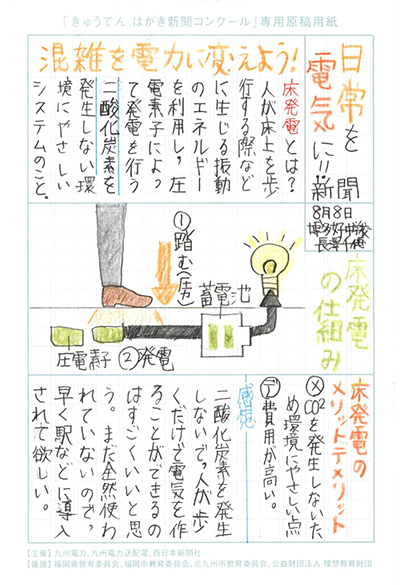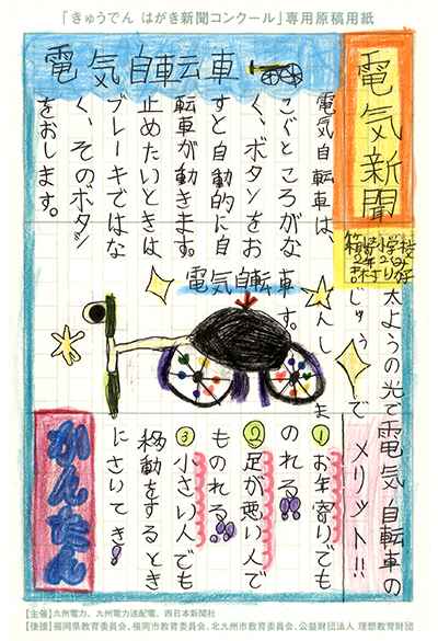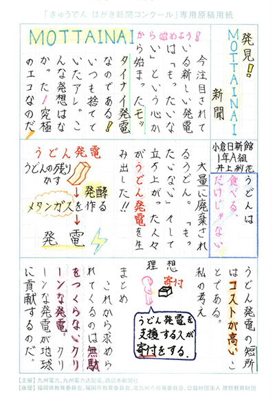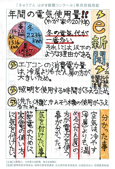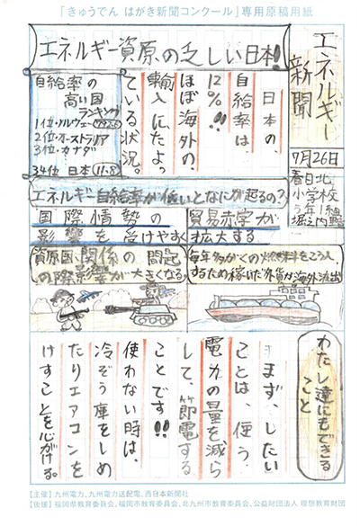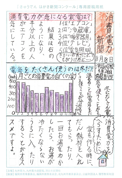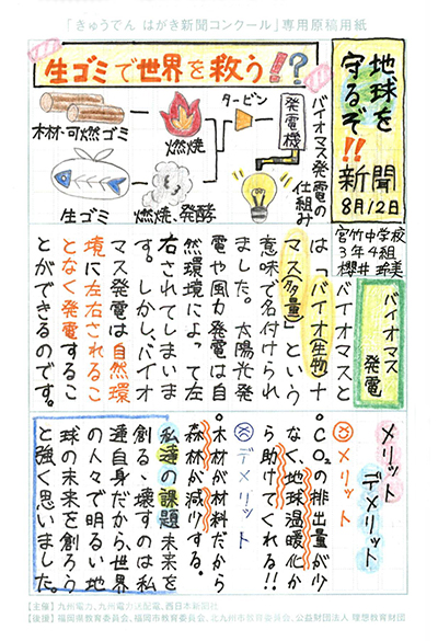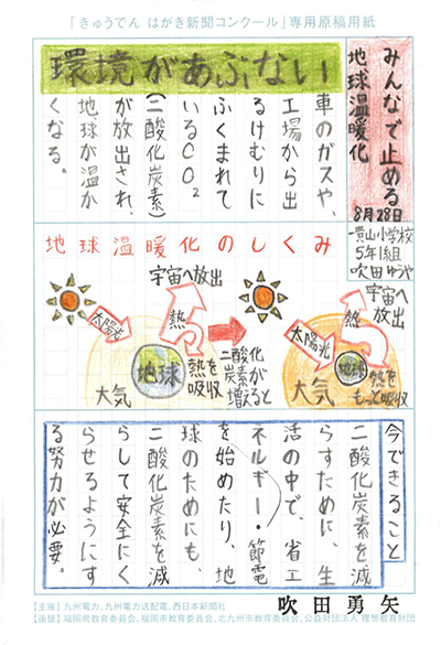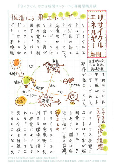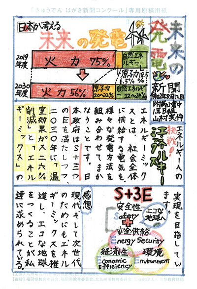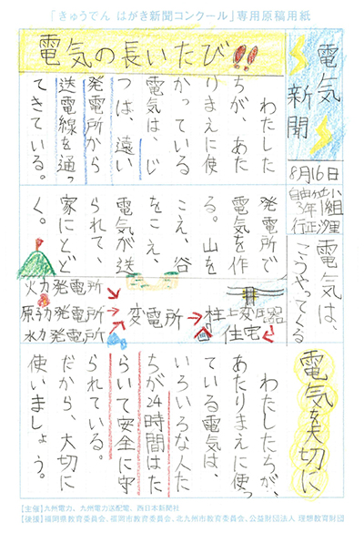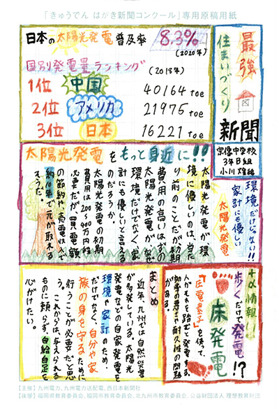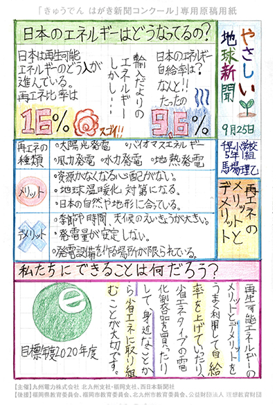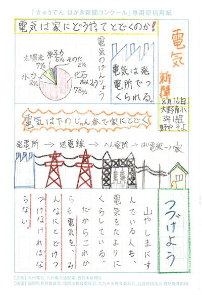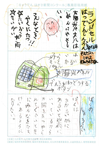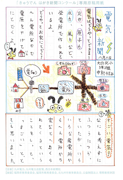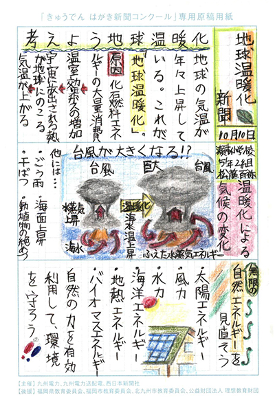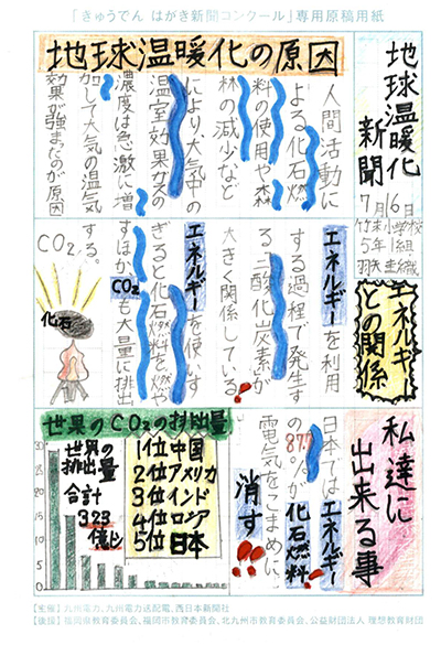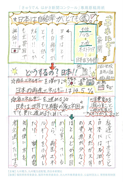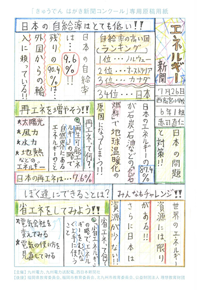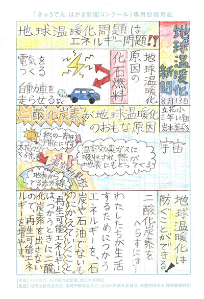 エネルギーや環境問題について関心を持ってもらおうと、九州電力と西日本新聞社が企画した「第4回きゅうでん はがき新聞コンクール」。福岡県内在住の小中学生から、自ら調べ、考えたことをまとめた力作が寄せられました。昨年を上回る4,276点の応募作品の中から選ばれた入賞作品・入賞者を紹介します。