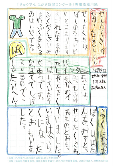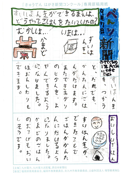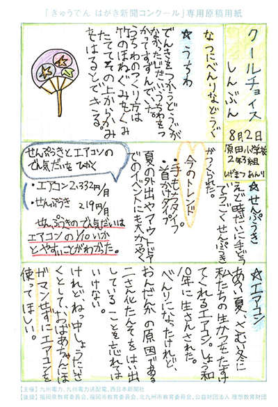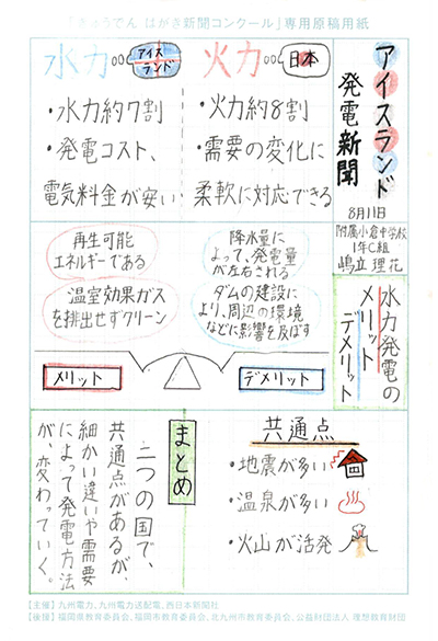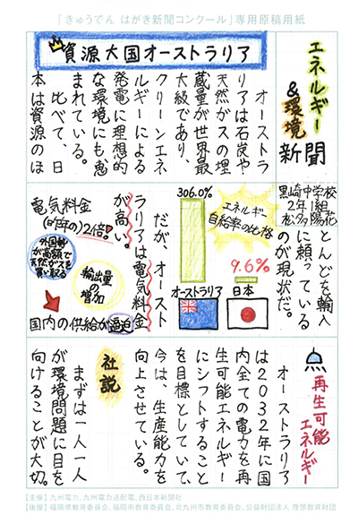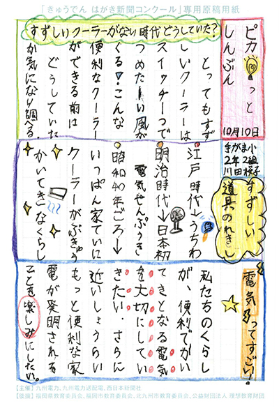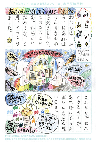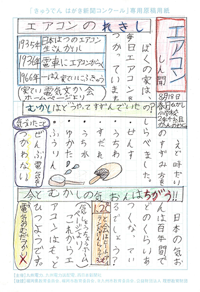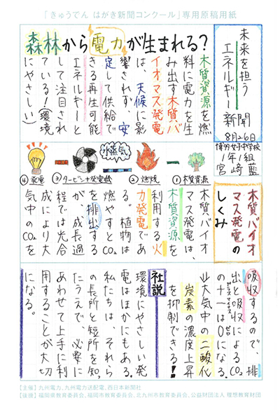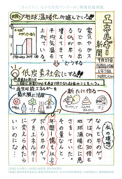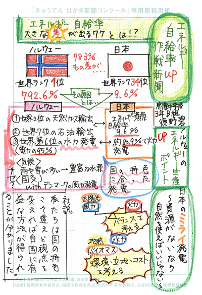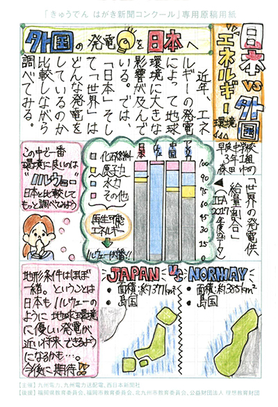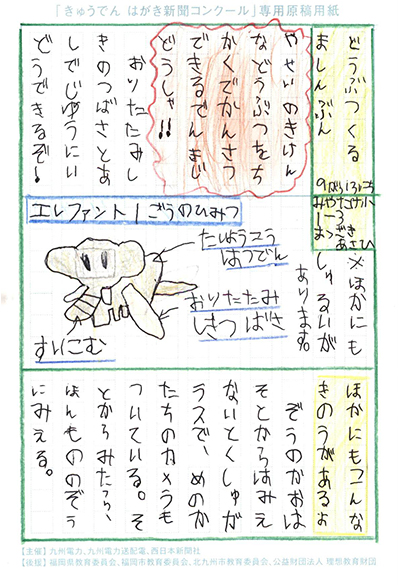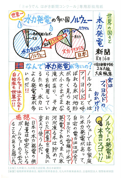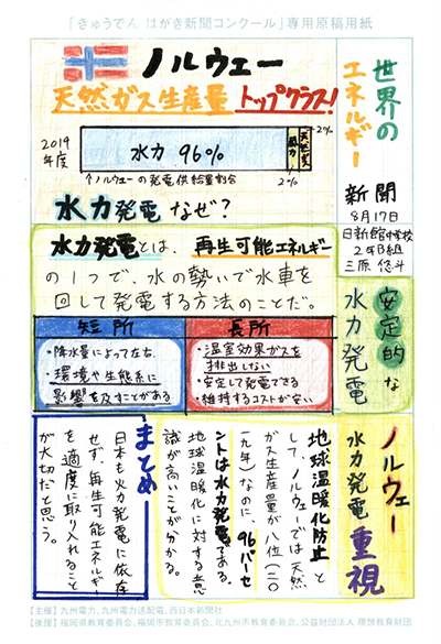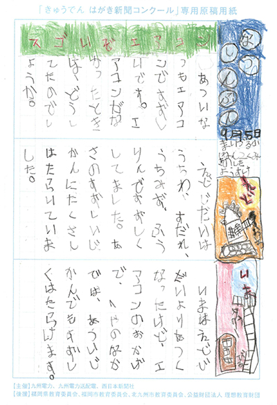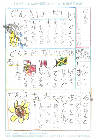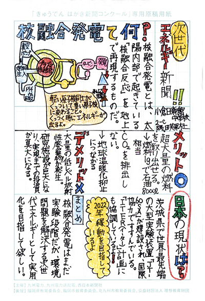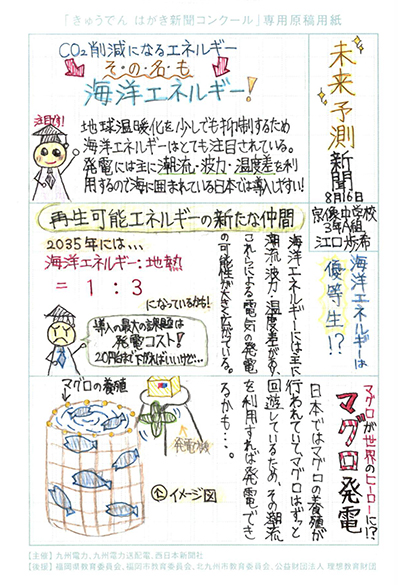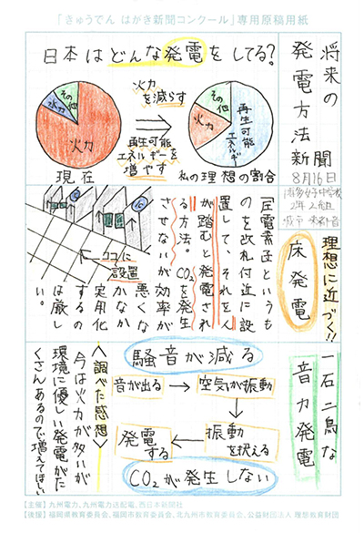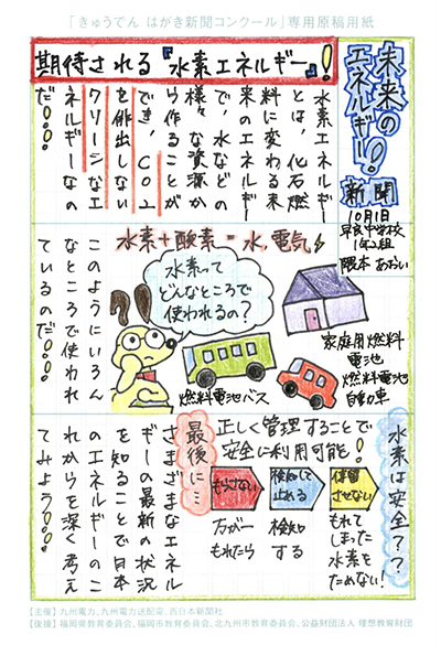 エネルギーや環境問題について関心を持ってもらおうと、九州電力と西日本新聞社が企画した「第4回きゅうでん はがき新聞コンクール」。福岡県内在住の小中学生から、自ら調べ、考えたことをまとめた力作が寄せられました。昨年を上回る4,276点の応募作品の中から選ばれた入賞作品・入賞者を紹介します。
