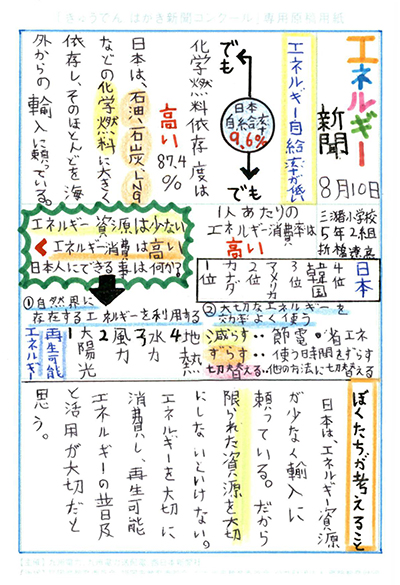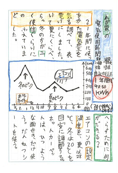 「コロナとくべつへん」というタイトルが本物の新聞みたいで、全文を読みたくなります。「電気代がどれだけ上がったのか」という問いを立て、絵で紹介したりグラフでわかりやすく示したりして、①から④の箇条書きでうまくまとめています。ランキングのコーナーも効果的です。