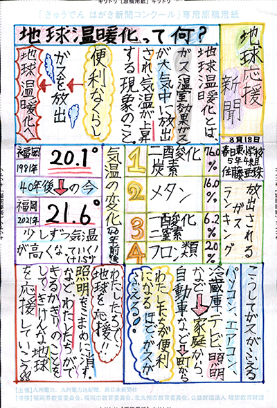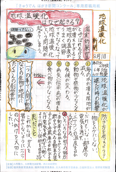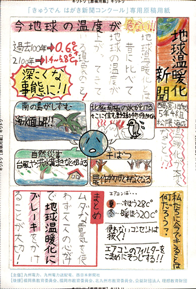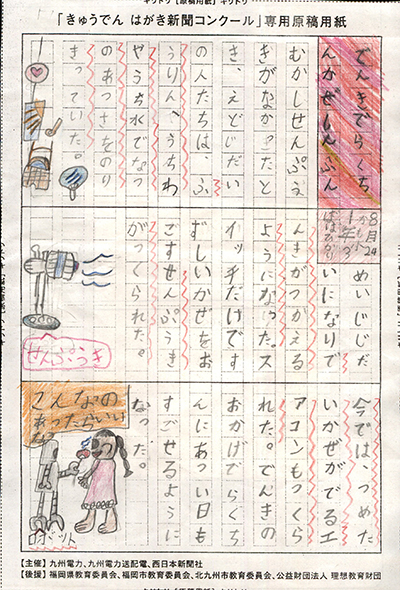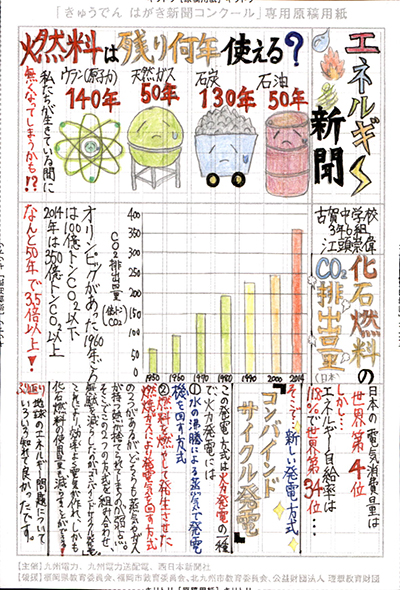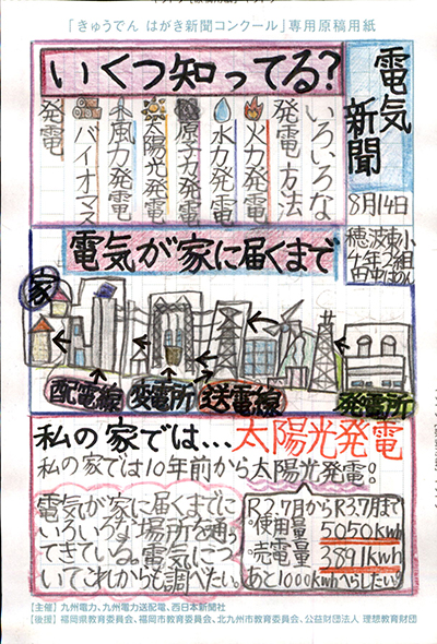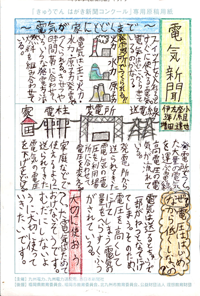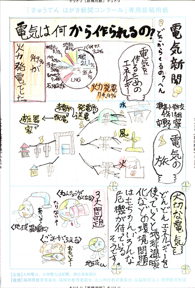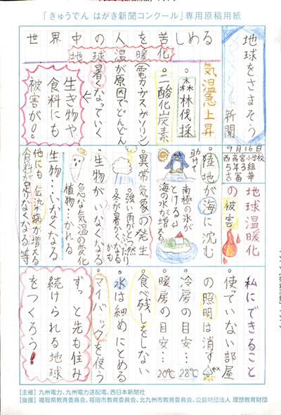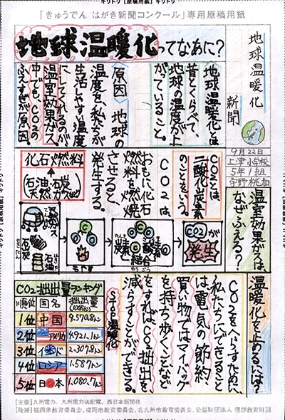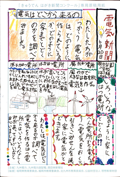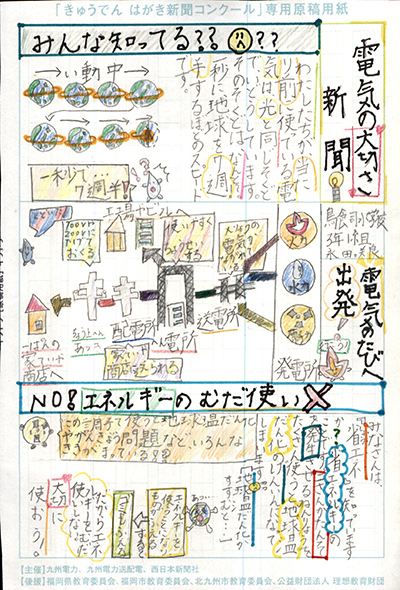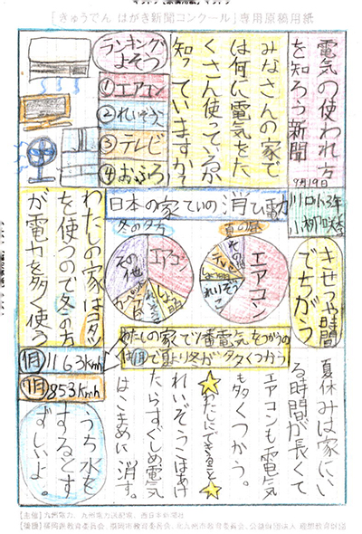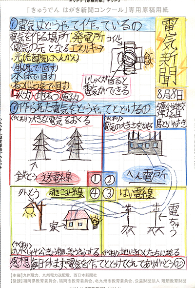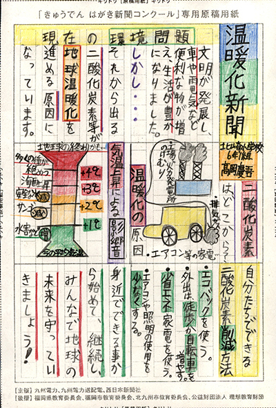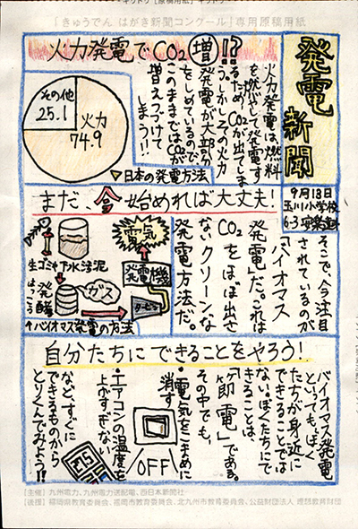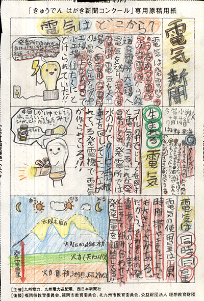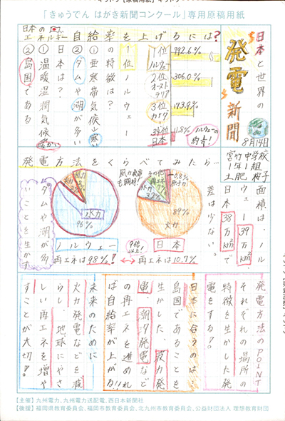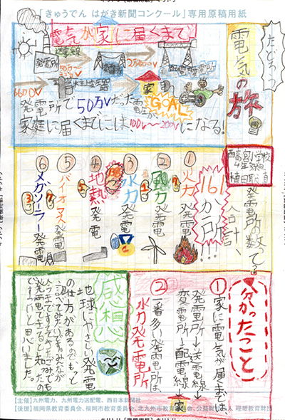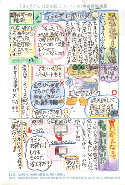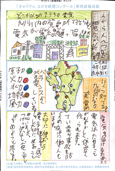 エネルギーや環境問題について関心を持ってもらおうと、九州電力、九州電力送配電と西日本新聞社が企画した「第5回きゅうでん はがき新聞コンクール」。福岡県内在住の小中学生から、自ら調べ、考えたことをまとめた力作が寄せられました。昨年を上回る7,984点の応募作品の中から選ばれた入賞作品・入賞者を紹介します。