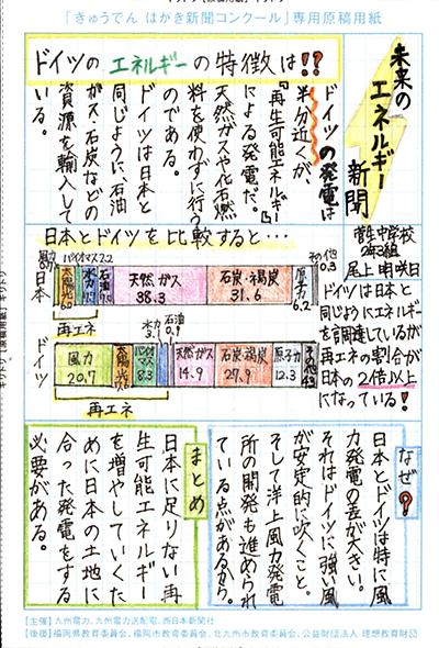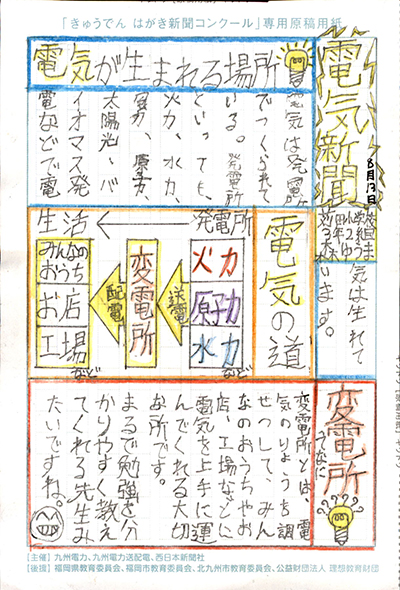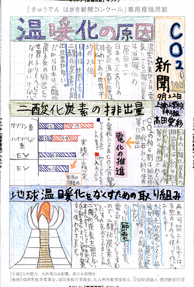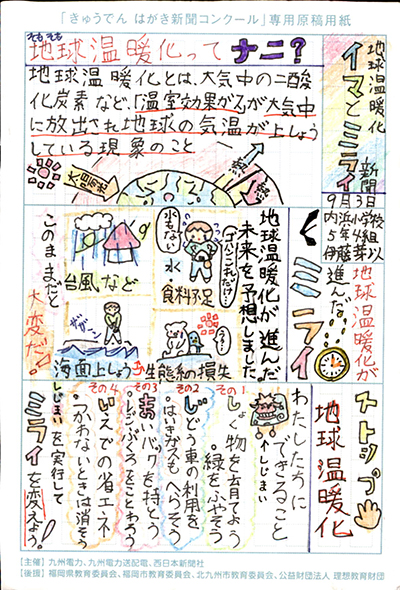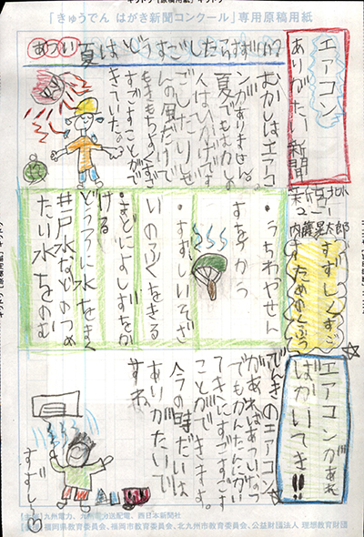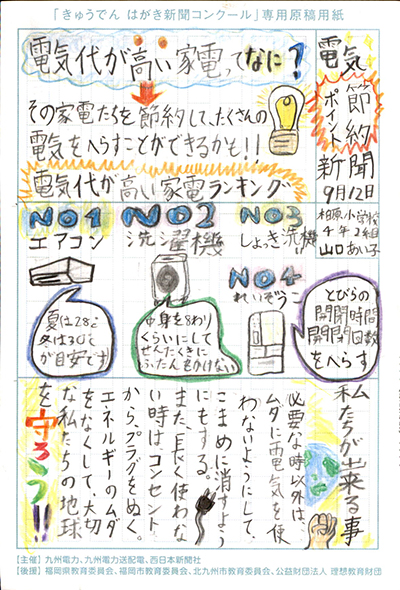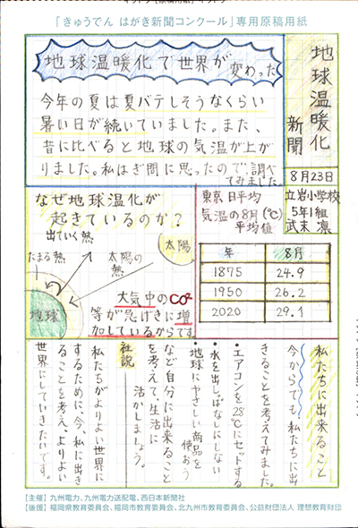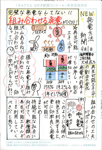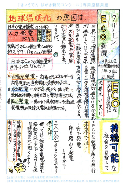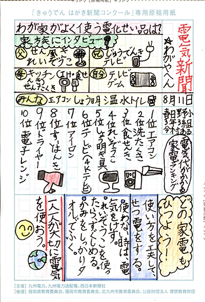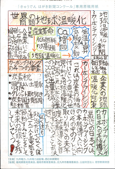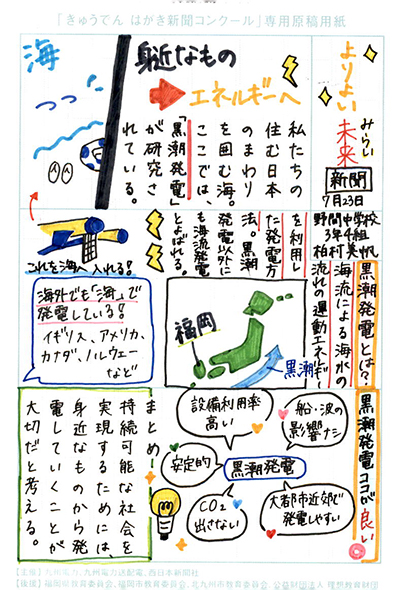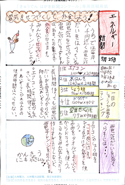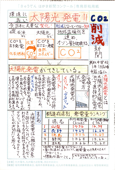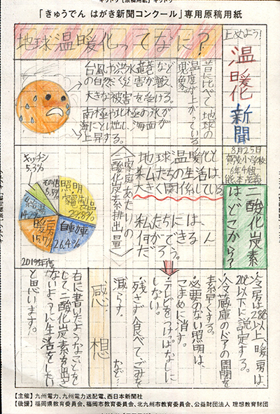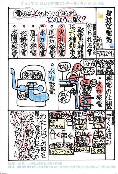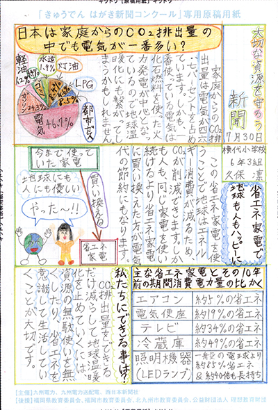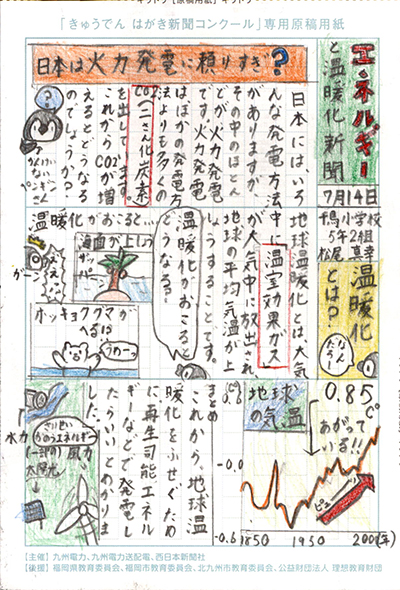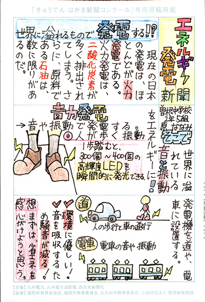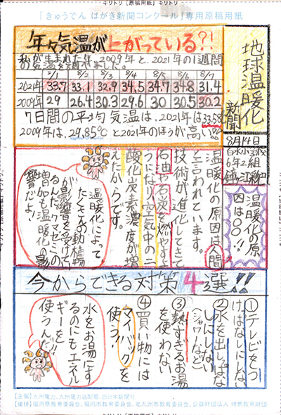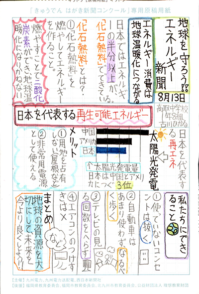 エネルギーや環境問題について関心を持ってもらおうと、九州電力、九州電力送配電と西日本新聞社が企画した「第5回きゅうでん はがき新聞コンクール」。福岡県内在住の小中学生から、自ら調べ、考えたことをまとめた力作が寄せられました。昨年を上回る7,984点の応募作品の中から選ばれた入賞作品・入賞者を紹介します。