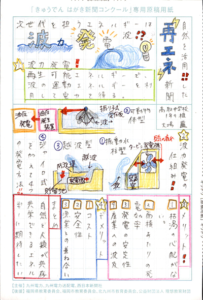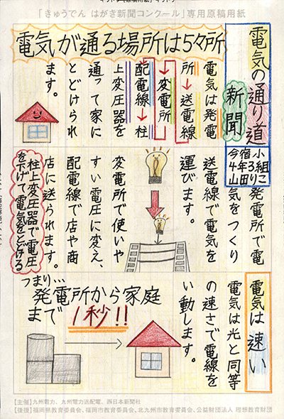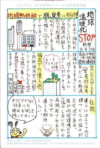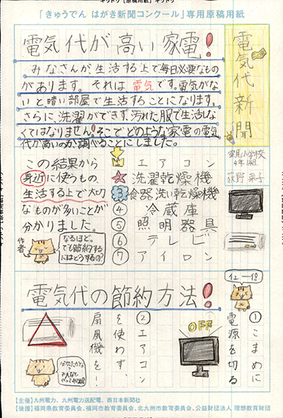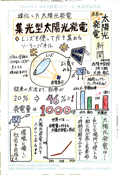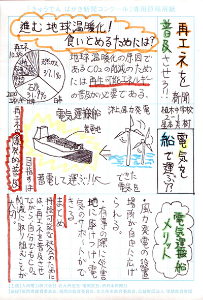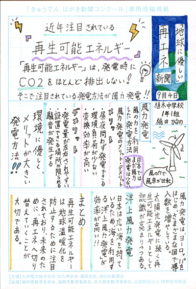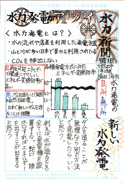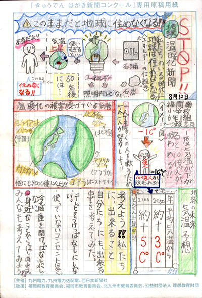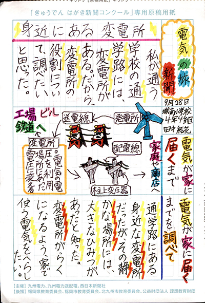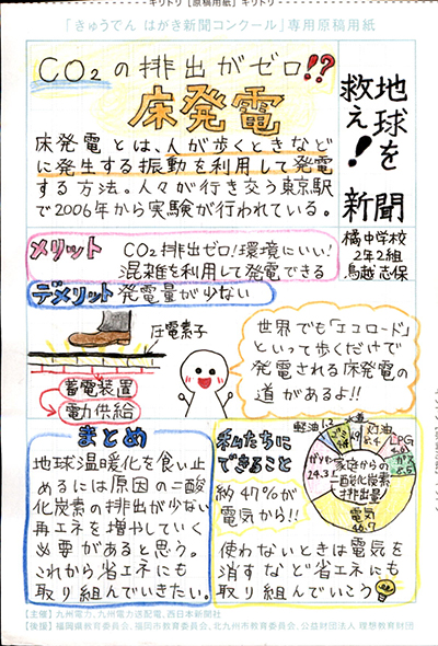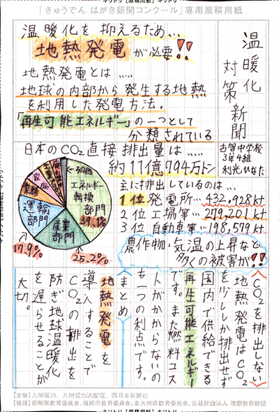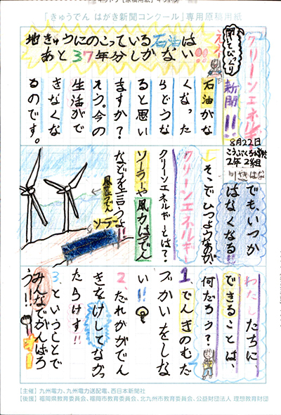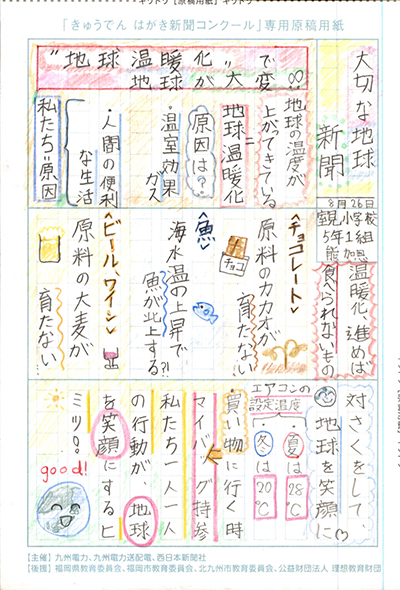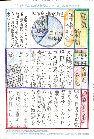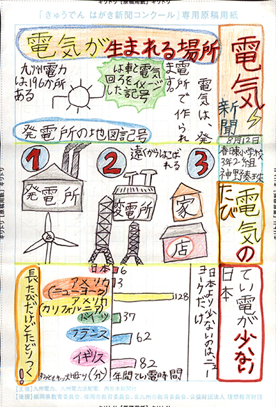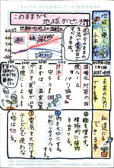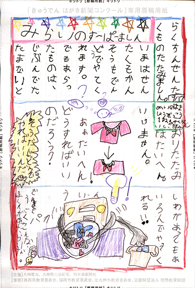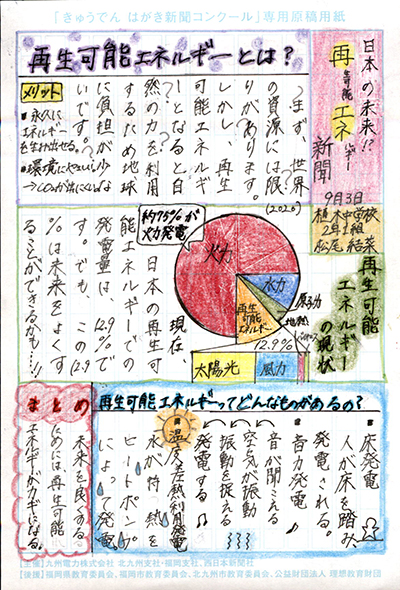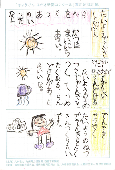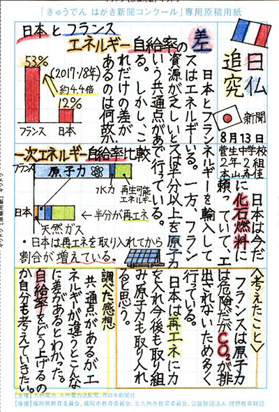 エネルギーや環境問題について関心を持ってもらおうと、九州電力、九州電力送配電と西日本新聞社が企画した「第5回きゅうでん はがき新聞コンクール」。福岡県内在住の小中学生から、自ら調べ、考えたことをまとめた力作が寄せられました。昨年を上回る7,984点の応募作品の中から選ばれた入賞作品・入賞者を紹介します。