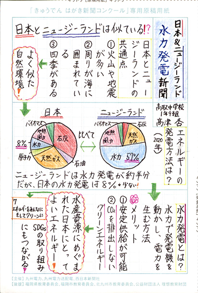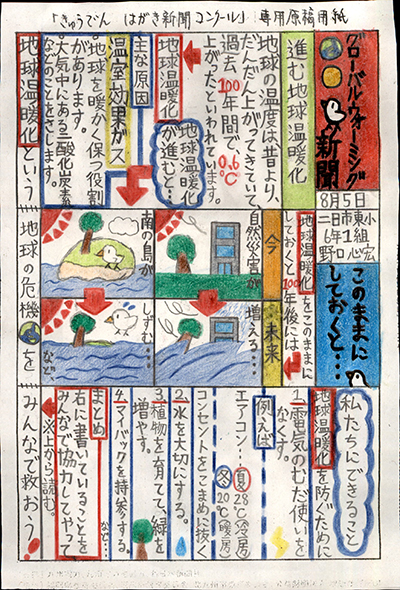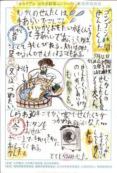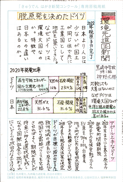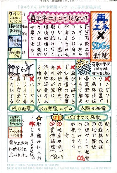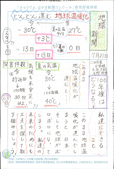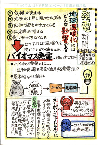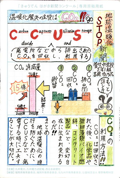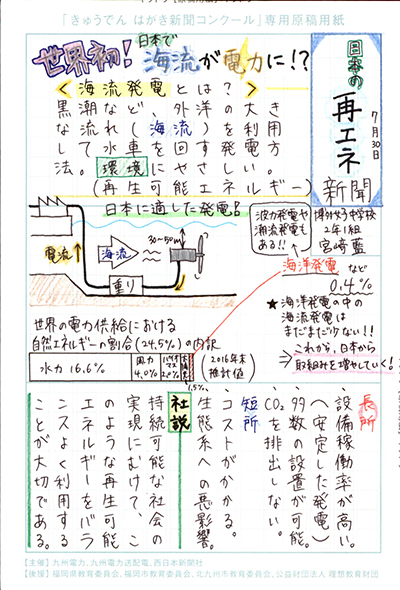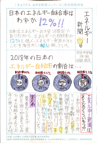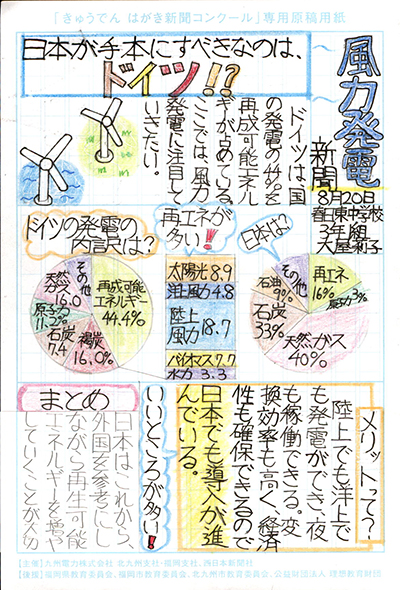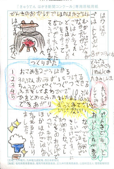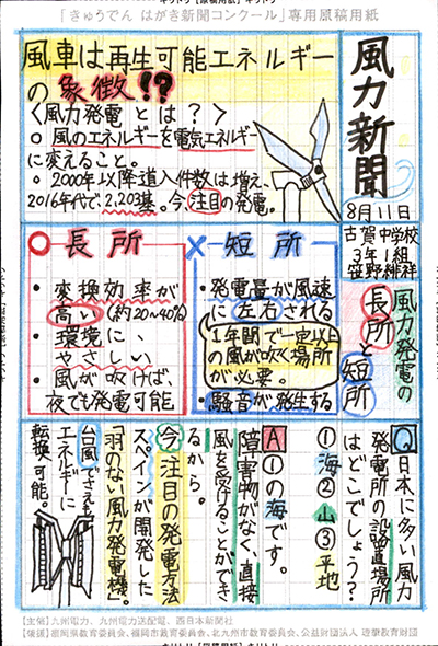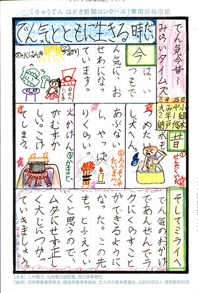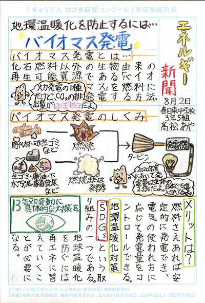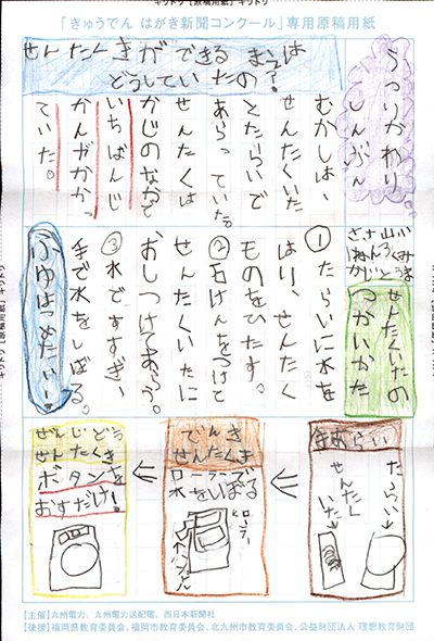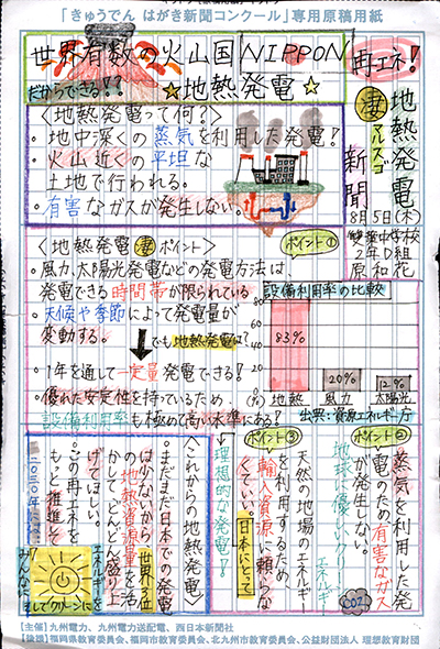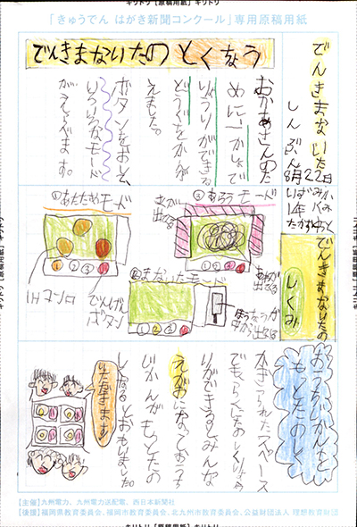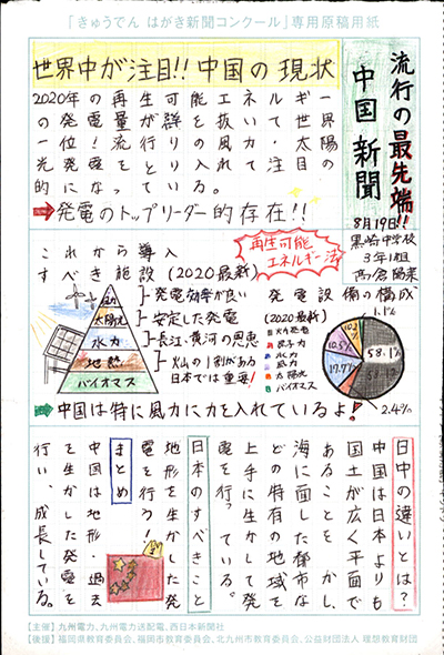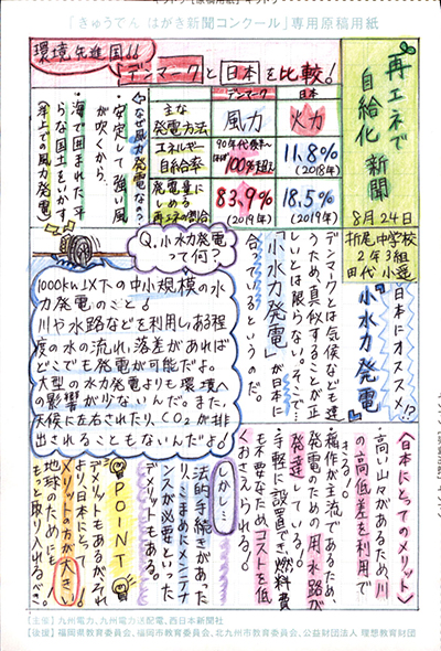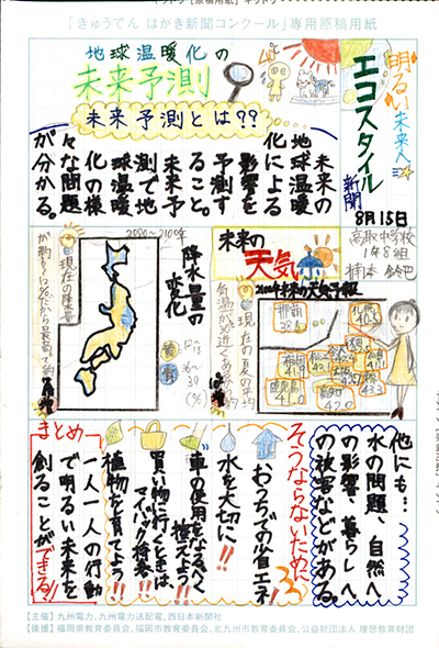 エネルギーや環境問題について関心を持ってもらおうと、九州電力、九州電力送配電と西日本新聞社が企画した「第5回きゅうでん はがき新聞コンクール」。福岡県内在住の小中学生から、自ら調べ、考えたことをまとめた力作が寄せられました。昨年を上回る7,984点の応募作品の中から選ばれた入賞作品・入賞者を紹介します。
