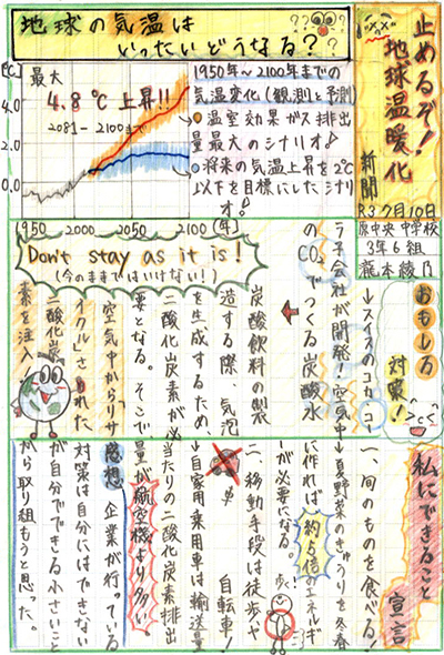 タイトル、見出し、図や表、見やすさの工夫、そして、三段目の「まとめ」と「感想」など、内容だけではなく、構成もしっかりと工夫されています。信頼できる正確な情報を選び、比較しながら思考し、自分の考えを言葉にすること。これからも続けてください。応援しています。