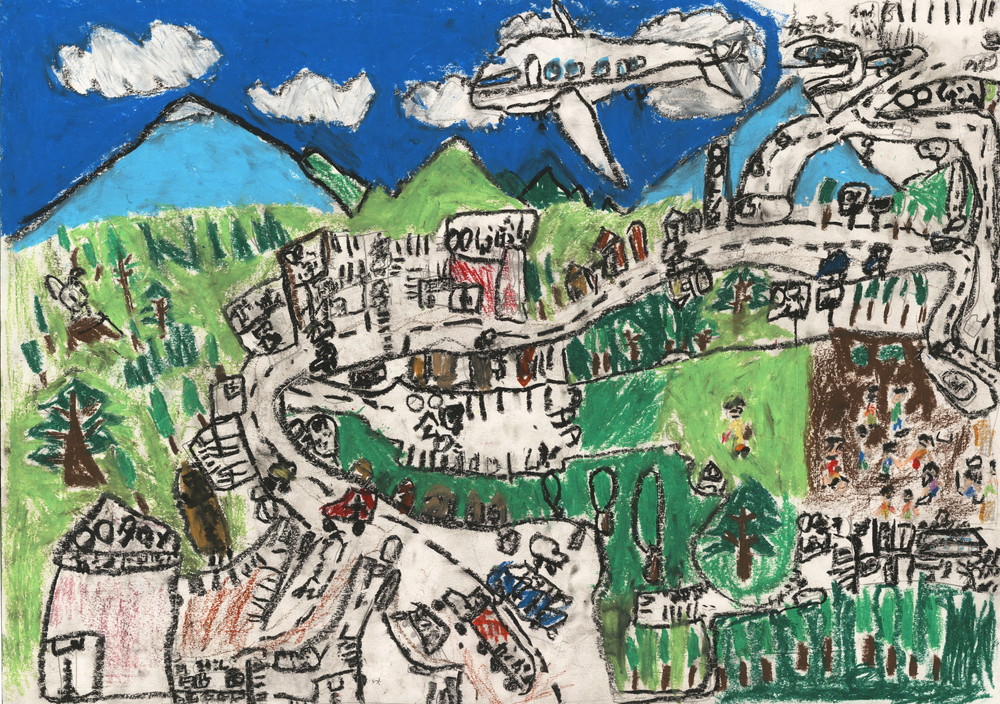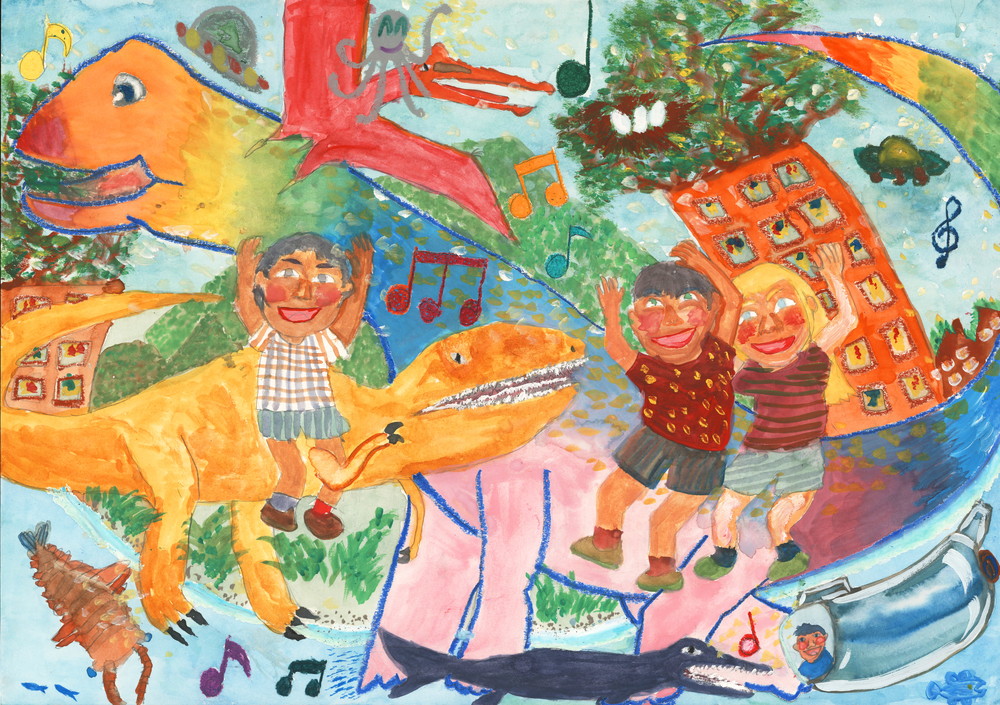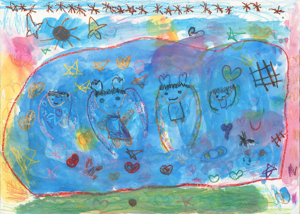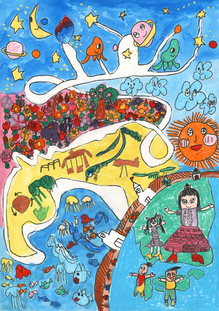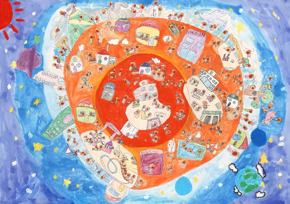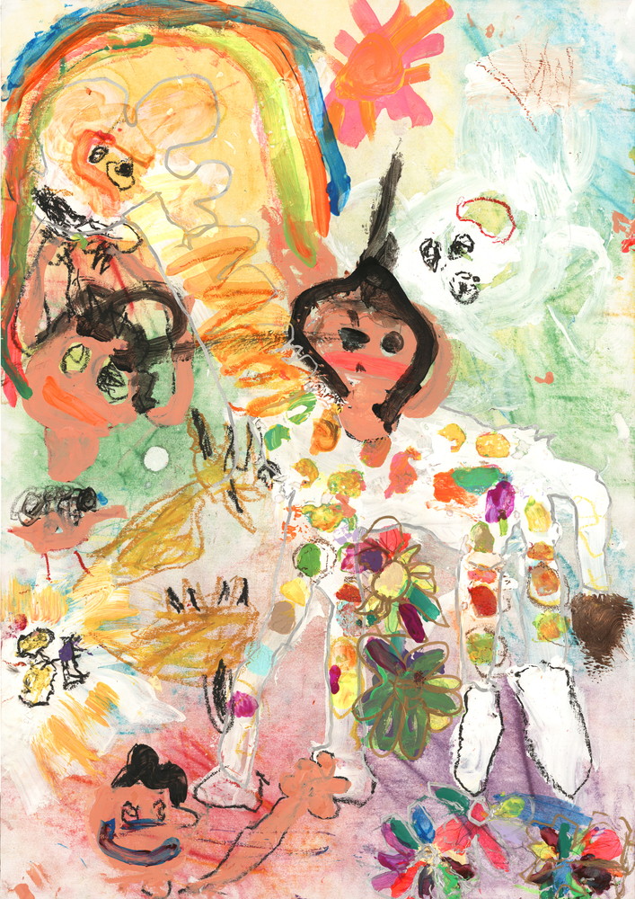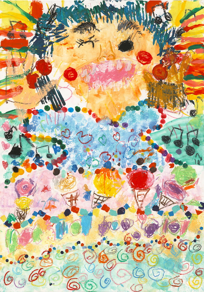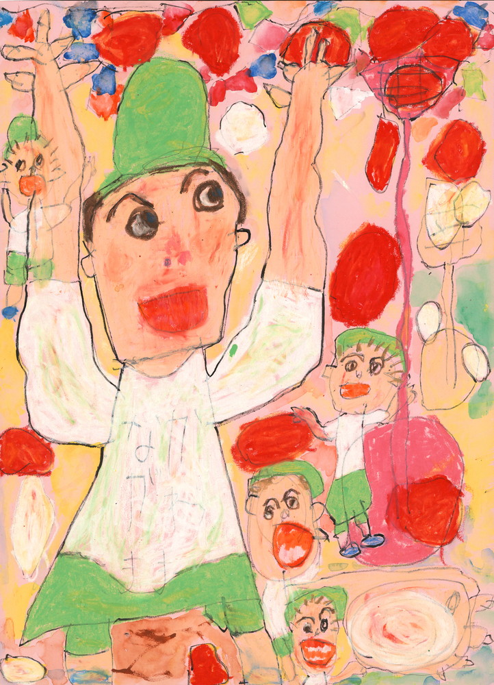 - 小さな子がこのように色面を生かして作品にすることができるのだなと感心させられます。作品からは、人や生き物の楽しそうな暮らしが感じられます。色の配置がとにかく素晴らしくて、中央の人物が自分自身なのでしょうか…楽しくあかるい明日を感じさせるような作品になっています。