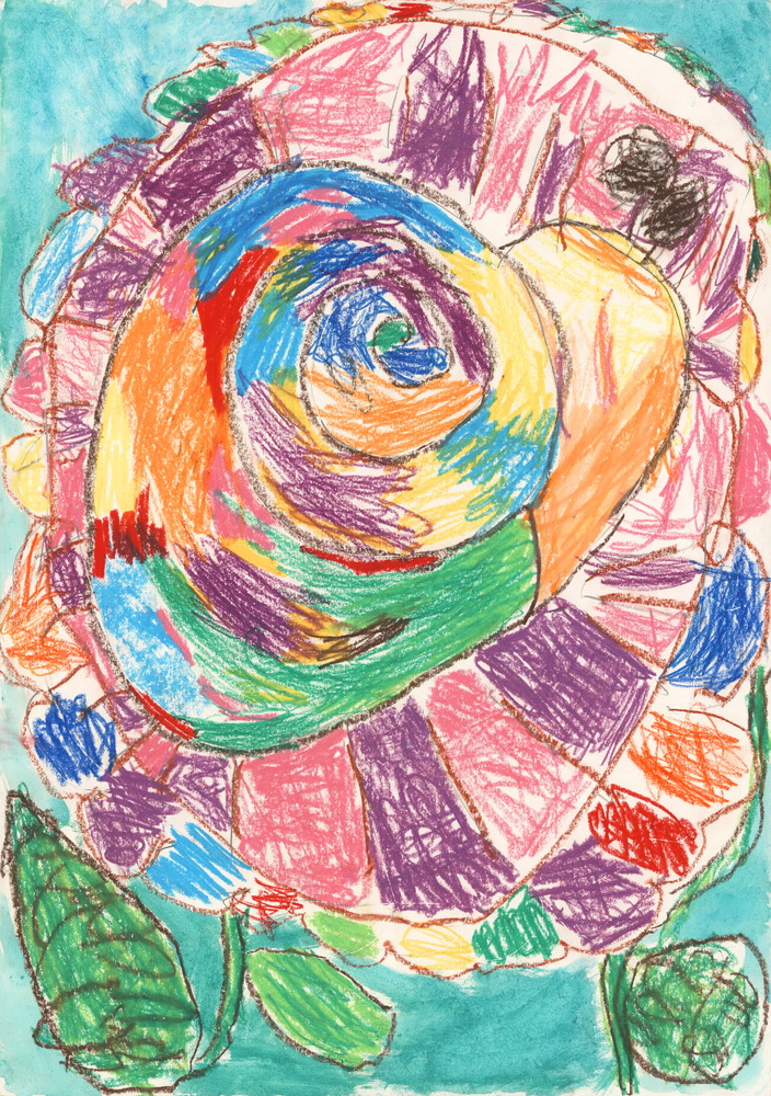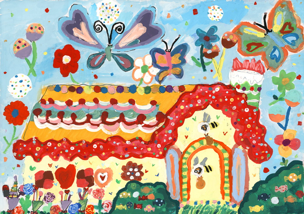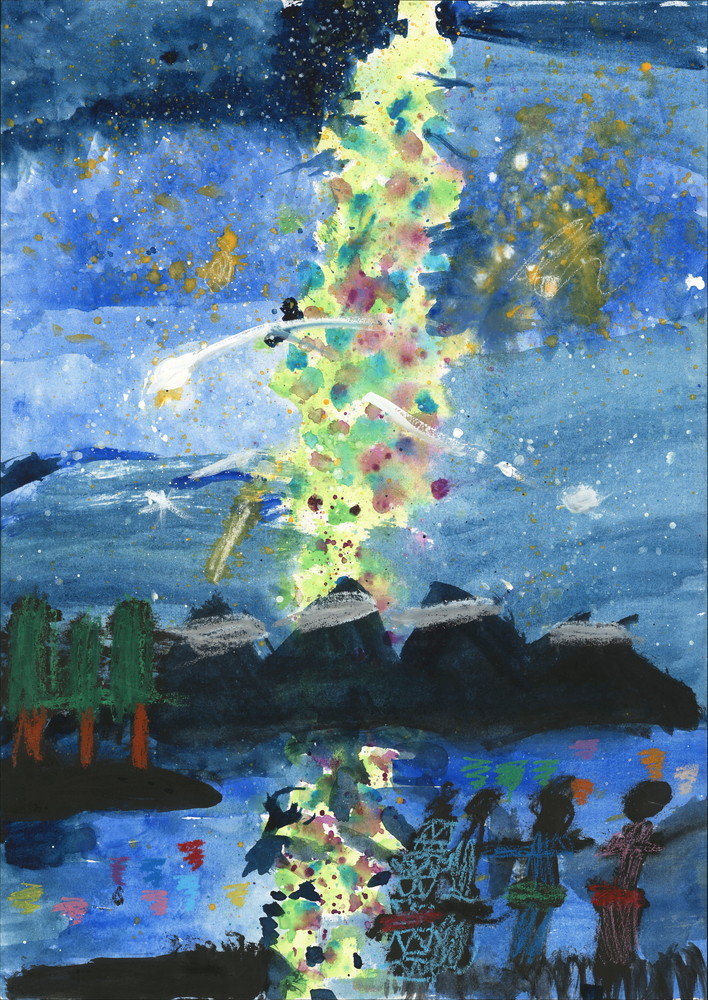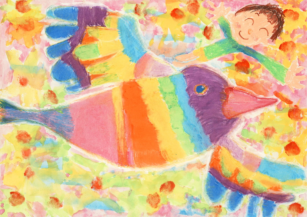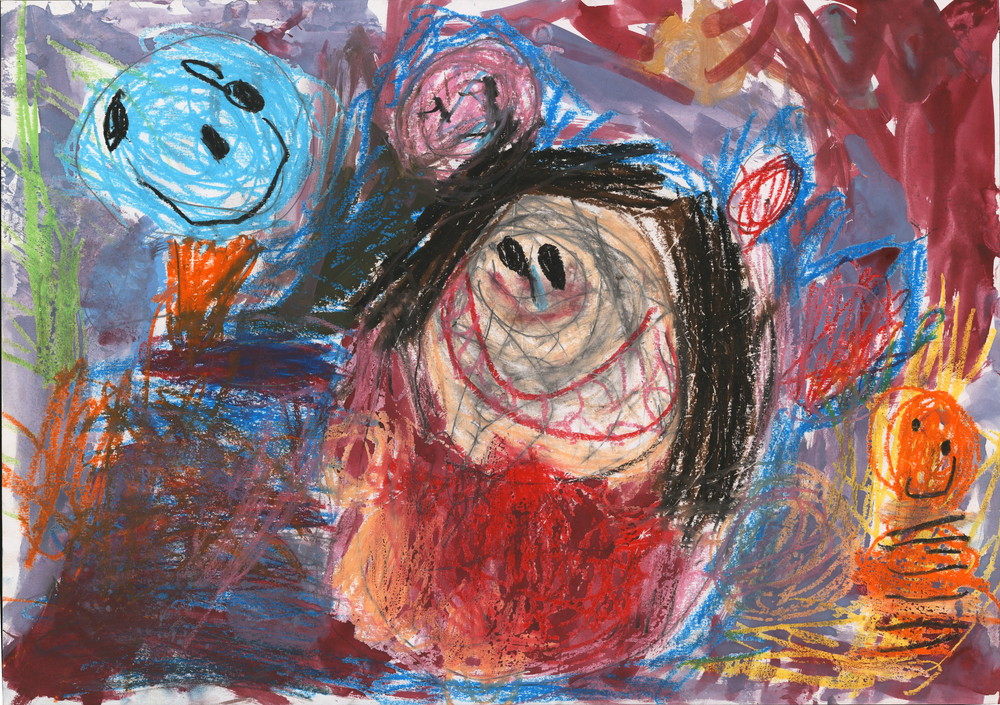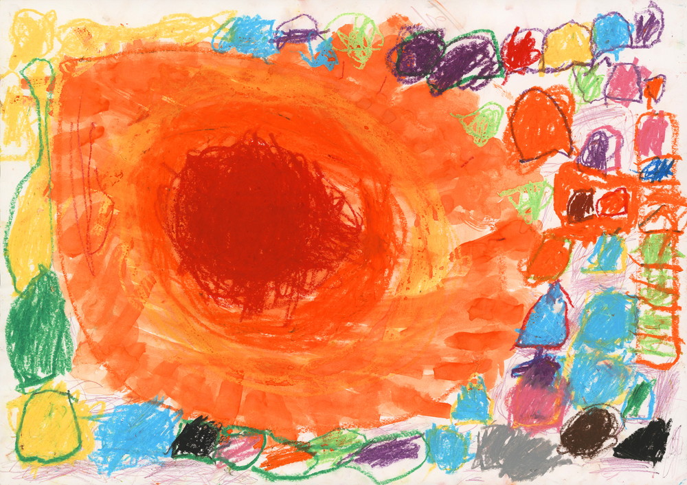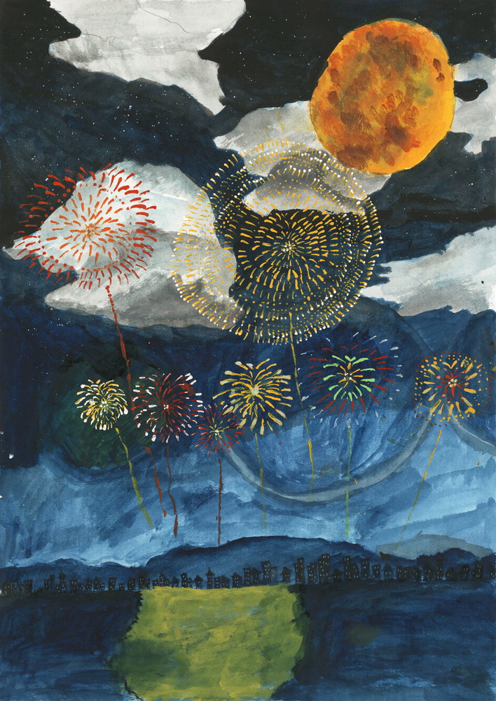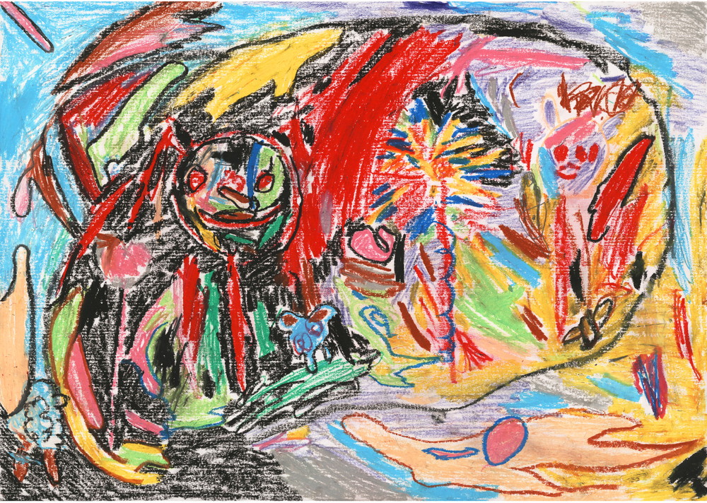 - 小さな子がこのように色面を生かして作品にすることができるのだなと感心させられます。作品からは、人や生き物の楽しそうな暮らしが感じられます。色の配置がとにかく素晴らしくて、中央の人物が自分自身なのでしょうか…楽しくあかるい明日を感じさせるような作品になっています。