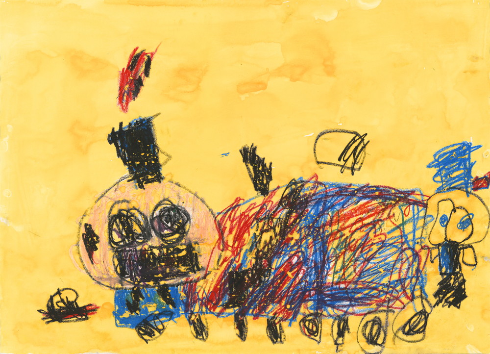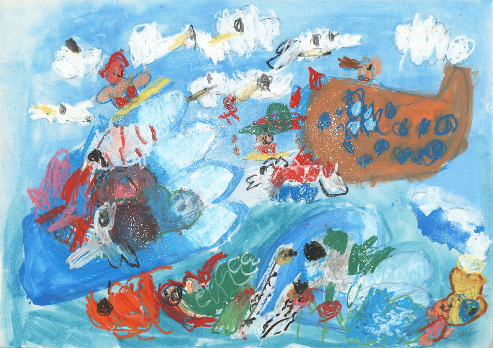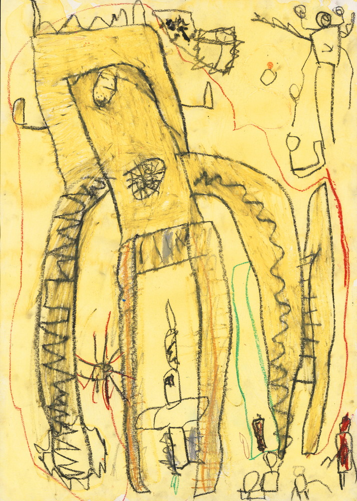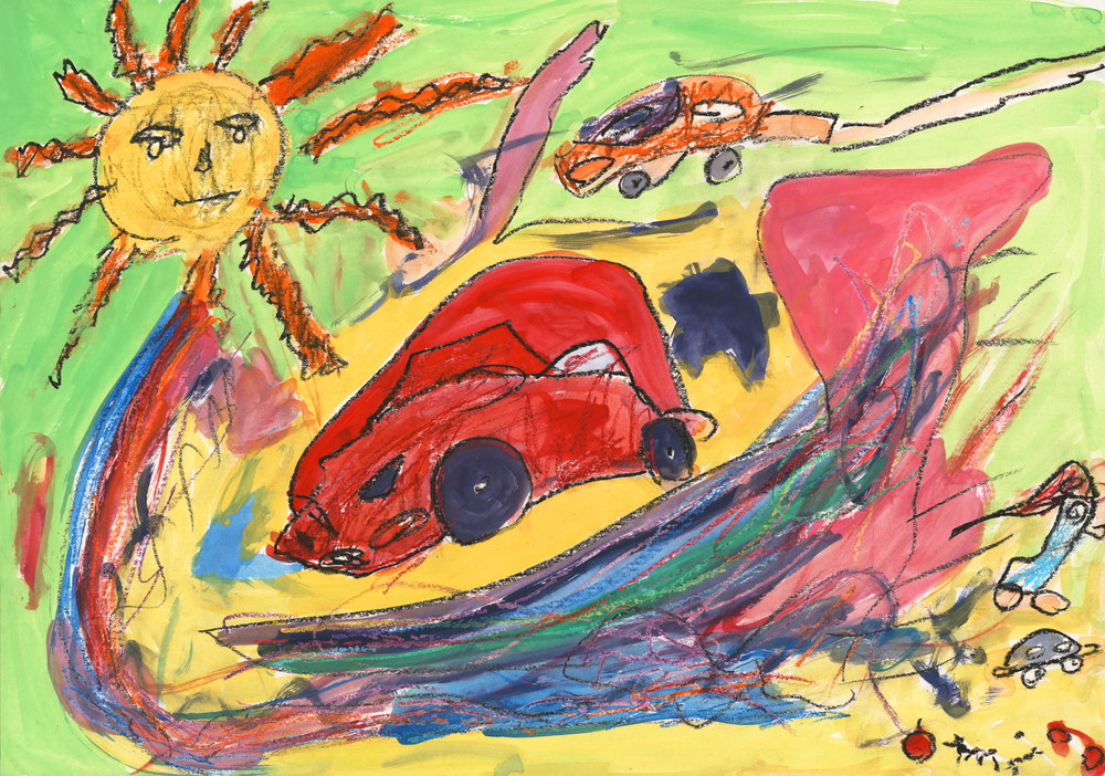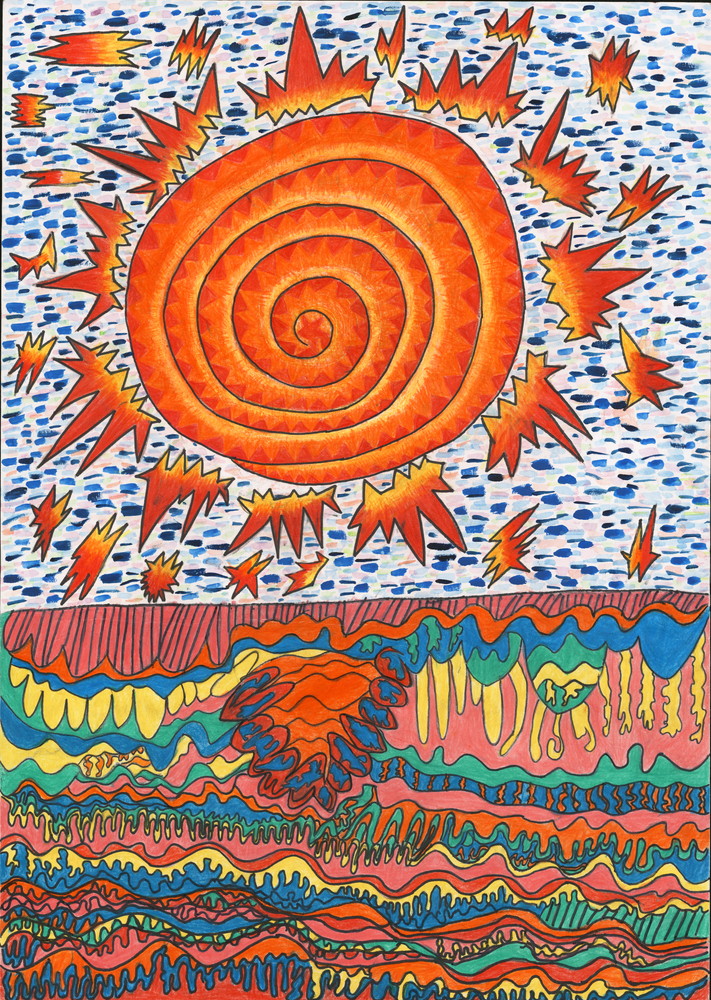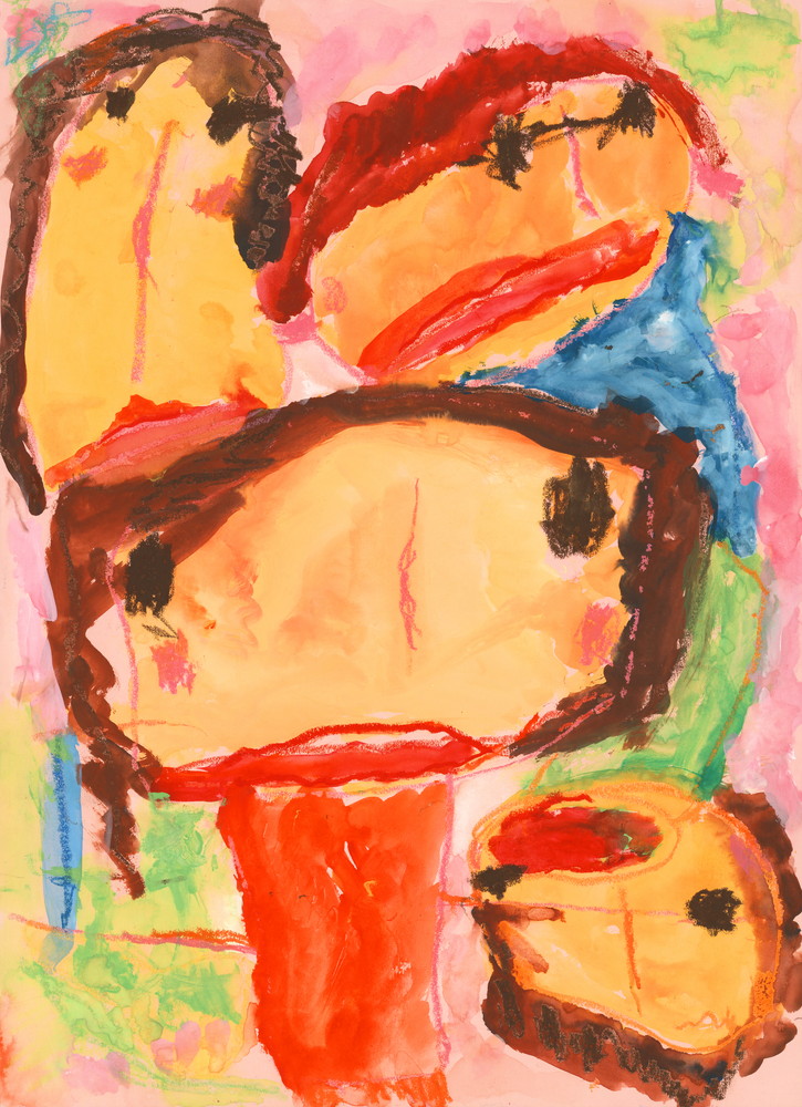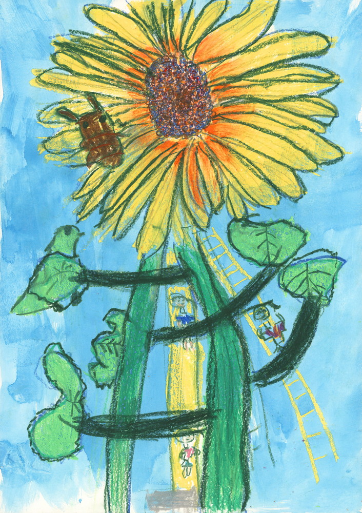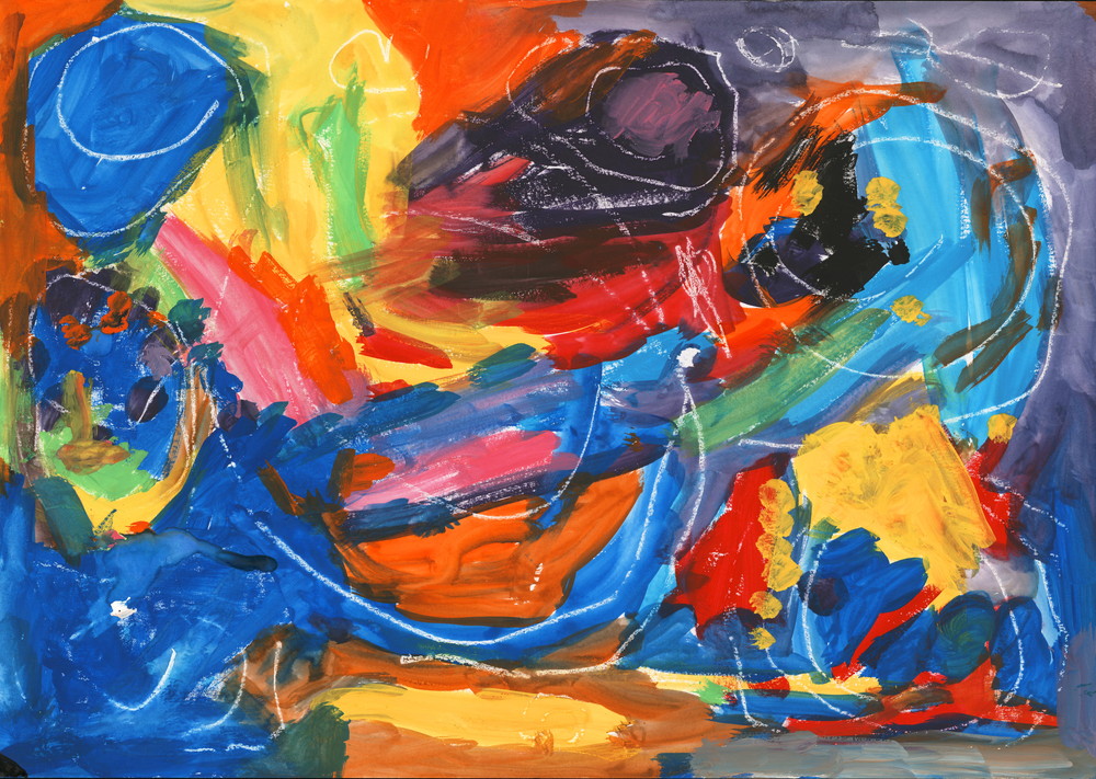 - 小さな子がこのように色面を生かして作品にすることができるのだなと感心させられます。作品からは、人や生き物の楽しそうな暮らしが感じられます。色の配置がとにかく素晴らしくて、中央の人物が自分自身なのでしょうか…楽しくあかるい明日を感じさせるような作品になっています。