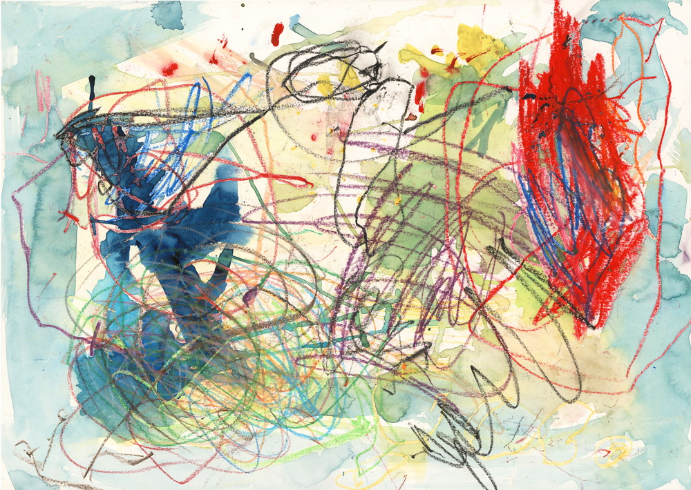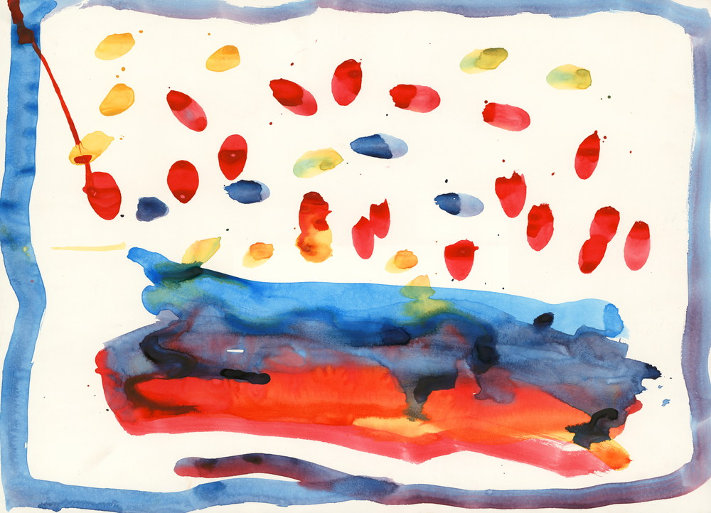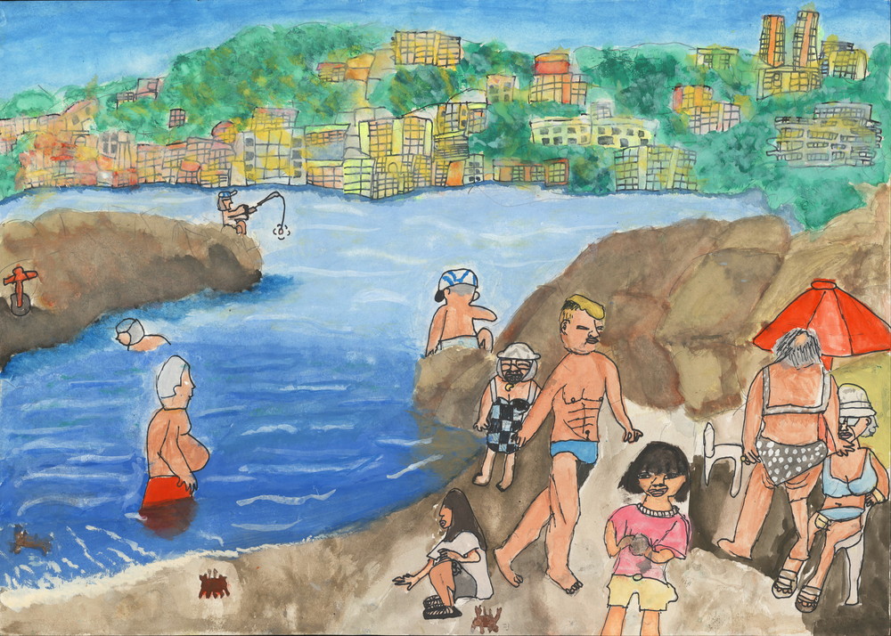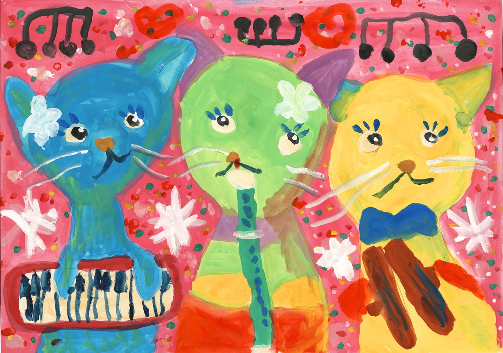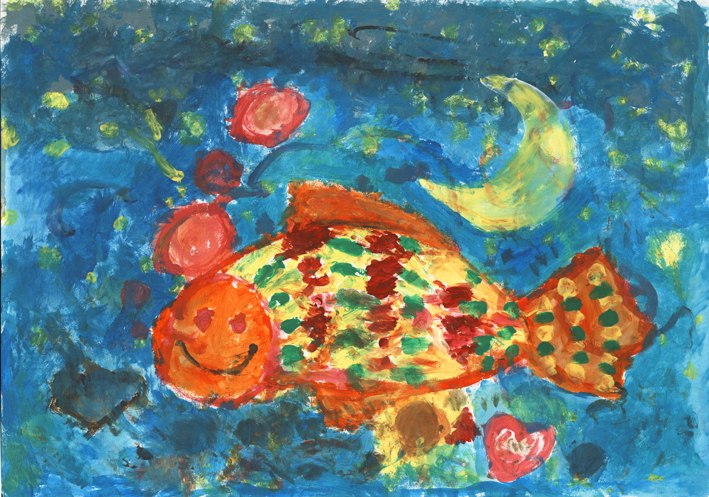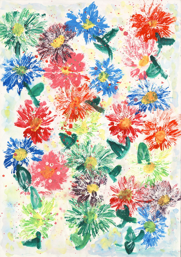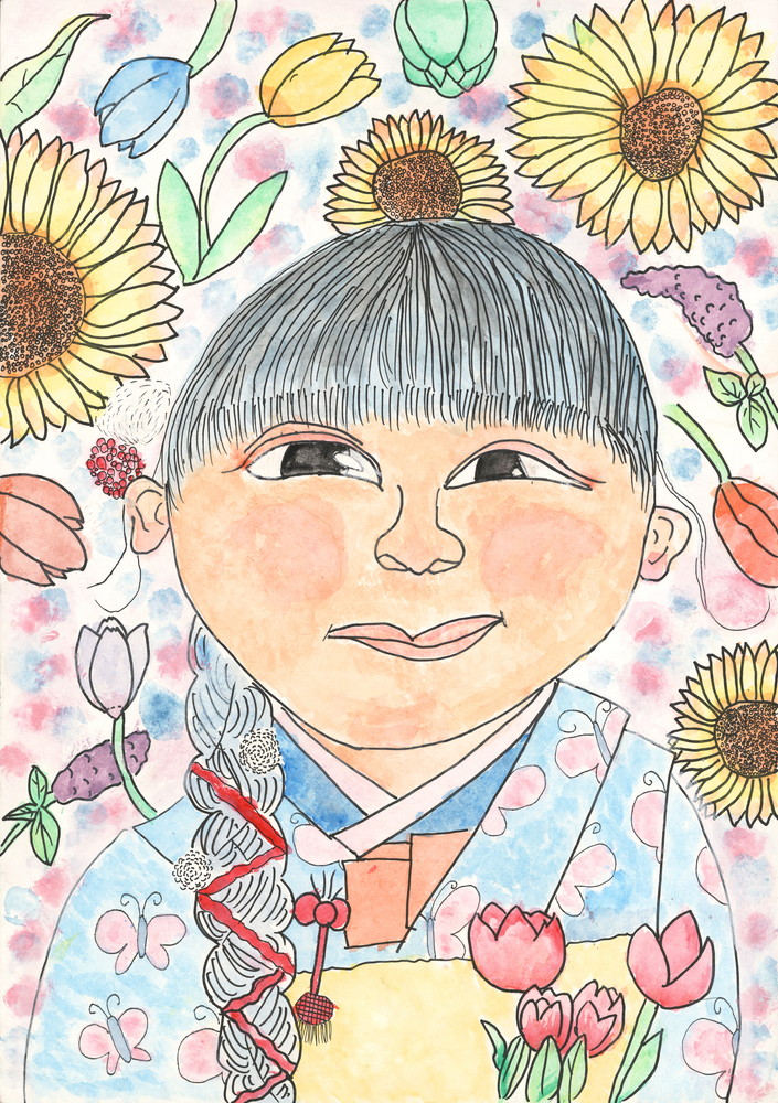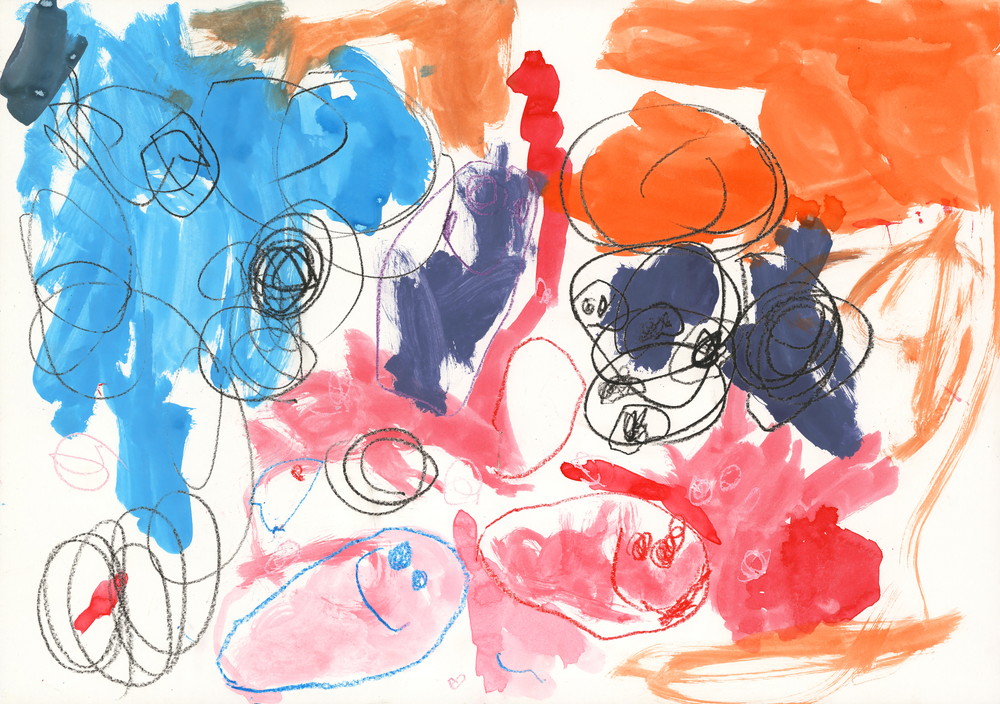 - 小さな子がこのように色面を生かして作品にすることができるのだなと感心させられます。作品からは、人や生き物の楽しそうな暮らしが感じられます。色の配置がとにかく素晴らしくて、中央の人物が自分自身なのでしょうか…楽しくあかるい明日を感じさせるような作品になっています。