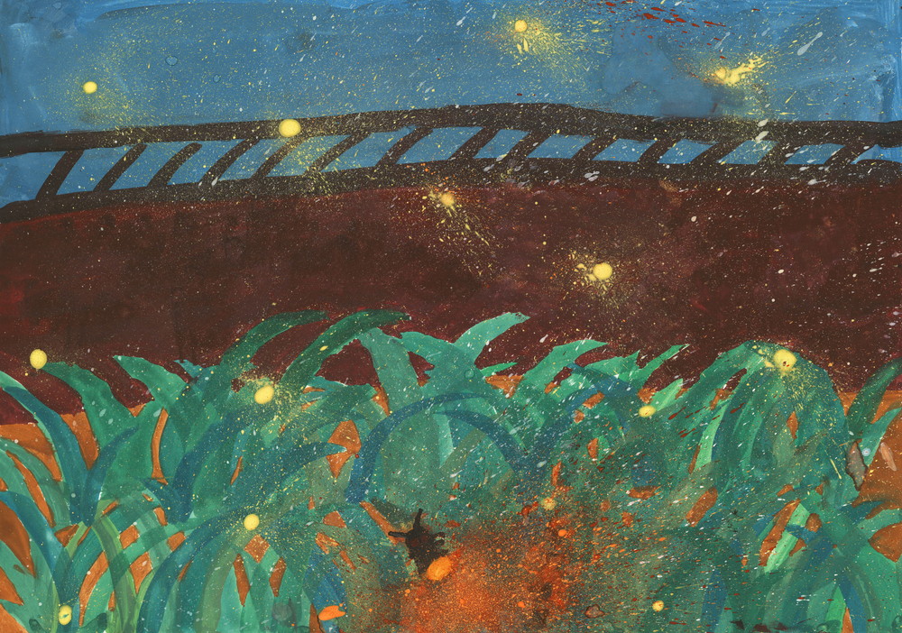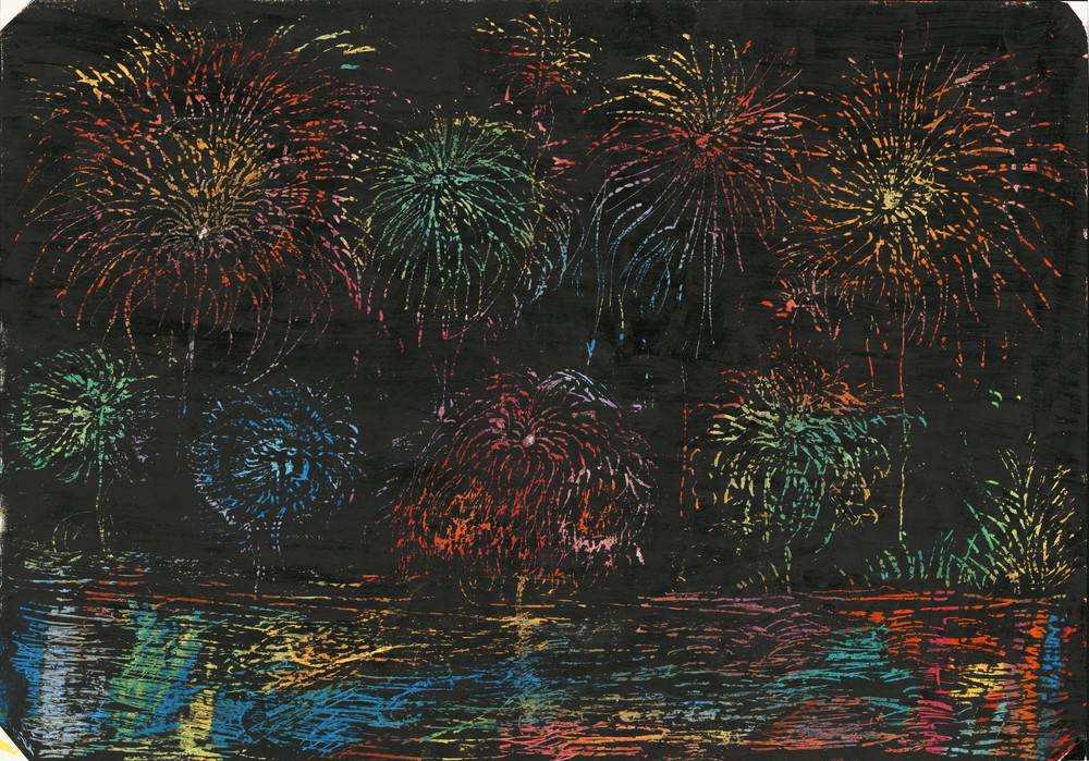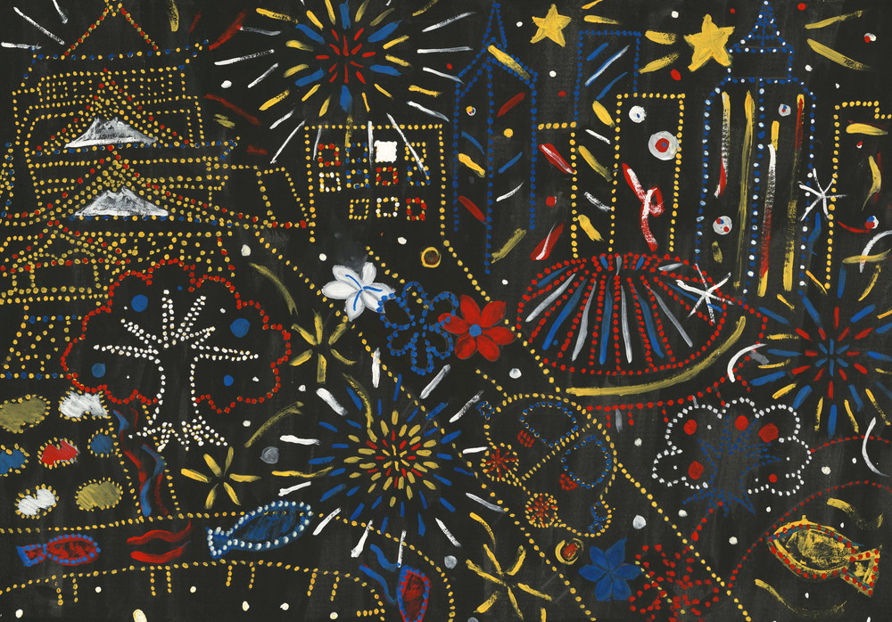 - 「熊本の光かがやく美しい街」というタイトルのとおり、熊本城や建物、樹木、生き物、そして夏の風物詩の花火等を真っ暗な背景の中に電飾が彩られたように描かれています。線描、点描による表現とにぎやかな画面構成が目をひく作品です。