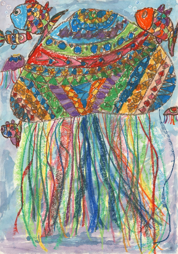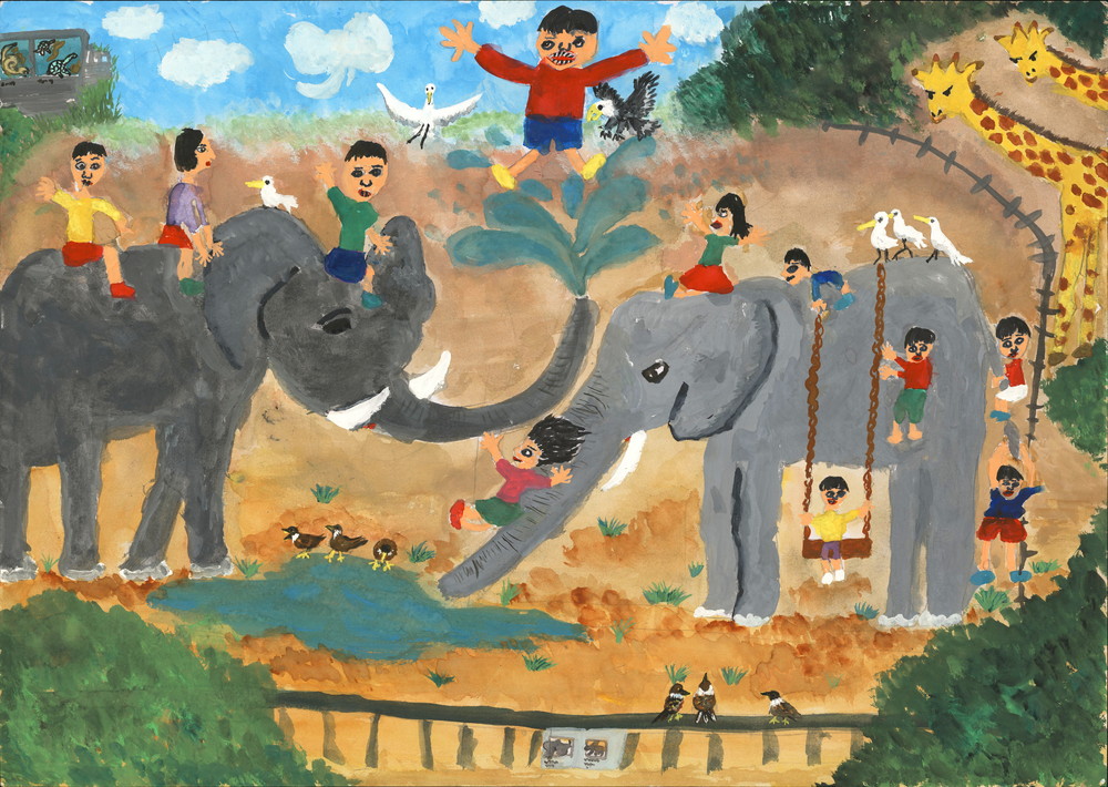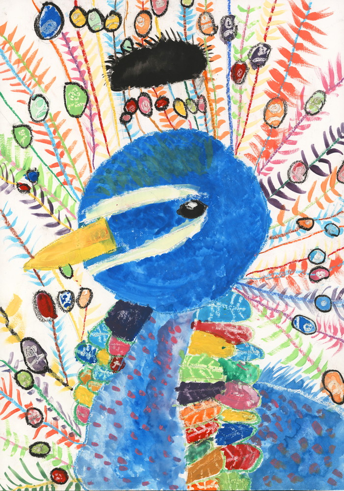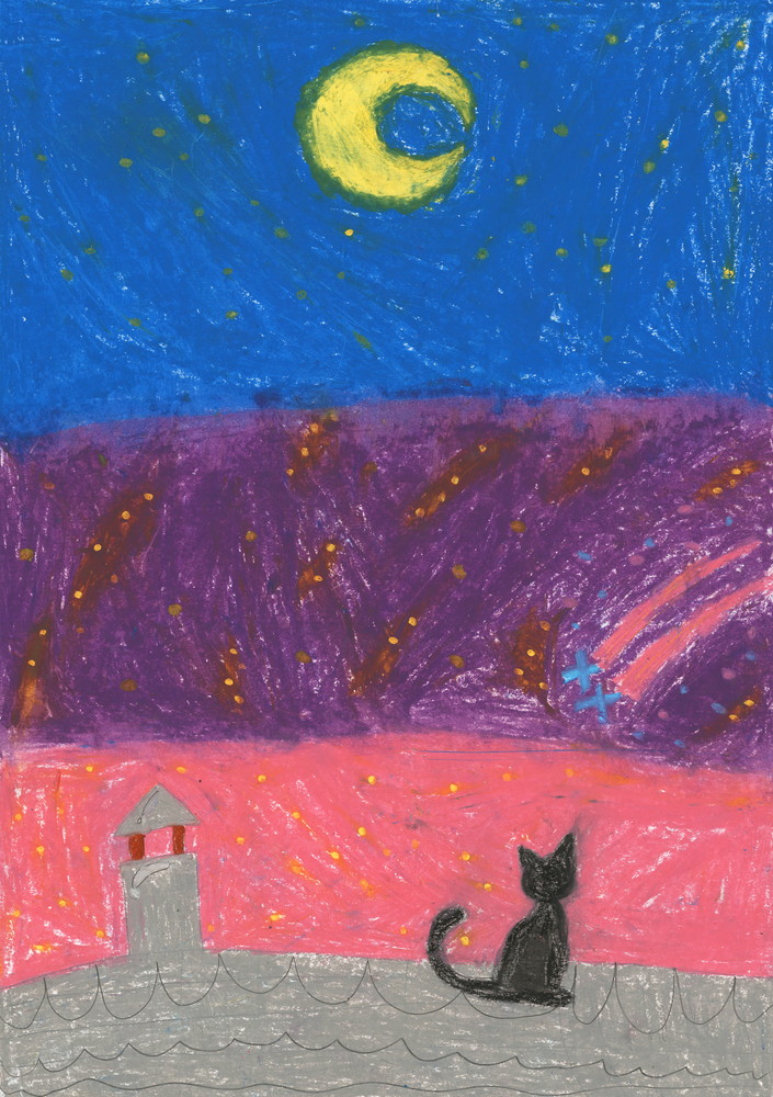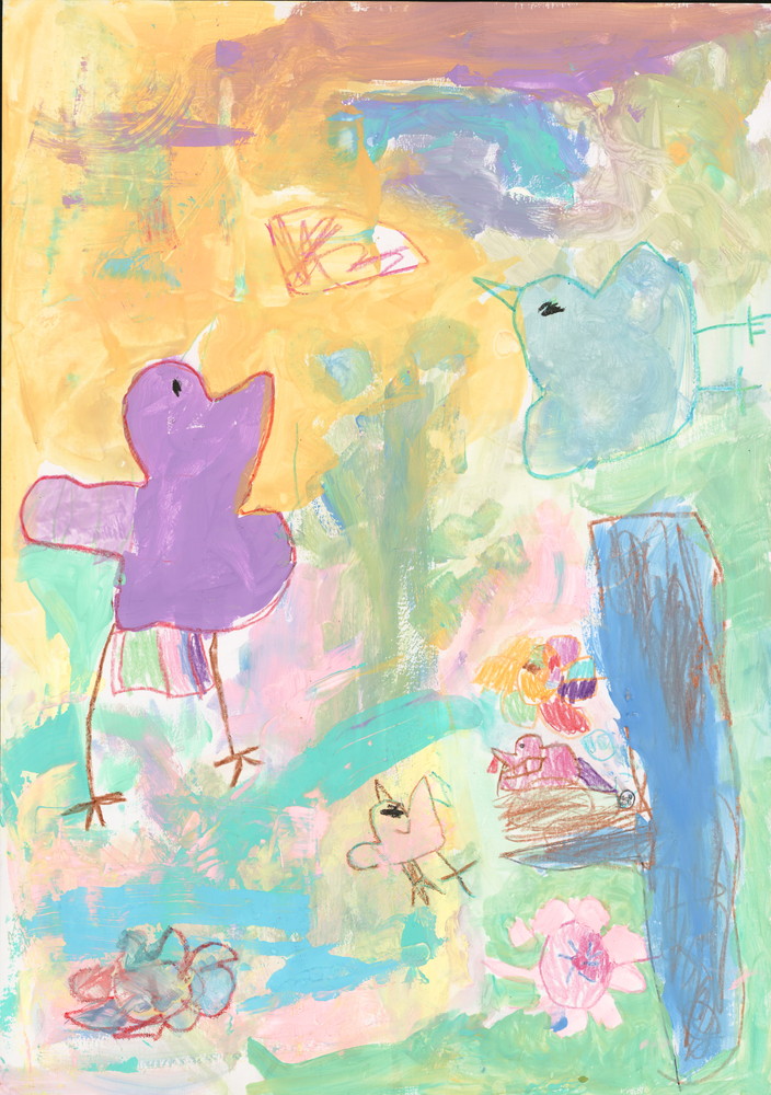 - 園児らしい感覚で動物園の生き物を捉えています。色も原色ではなくパステルカラーを用いたり、幾重にも塗り重ねることで深みが増しています。夜に活動的になる動物の様子をしっかり捉えることができました。