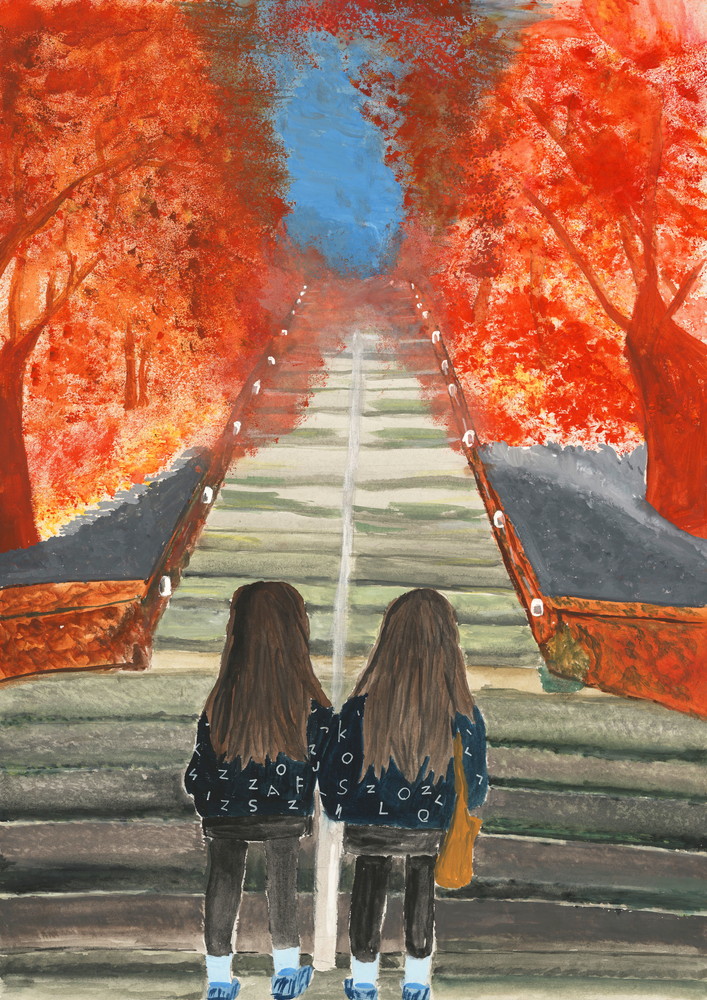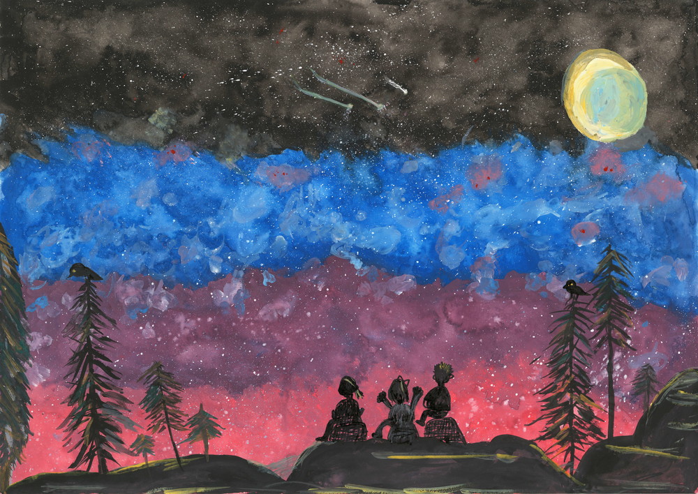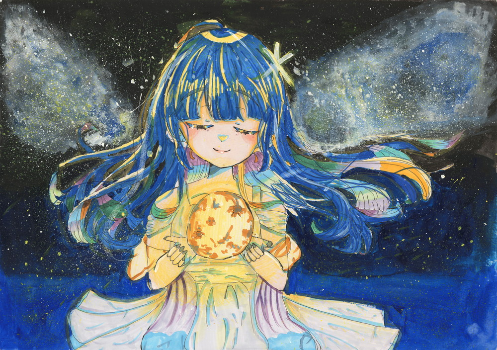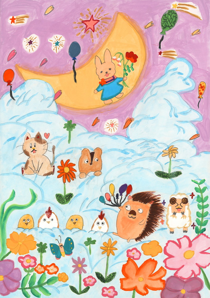 - 夜の動物園をテーマにした作品で、画面いっぱいに明るさが広がるダイナミックな構図が目を引きました。カラフルなきりんと登場人物の関係がユーモラスで、夢いっぱいの世界が広がっています。色づかいも鮮やかで、見る人にわくわくとした気持ちを与える作品です。