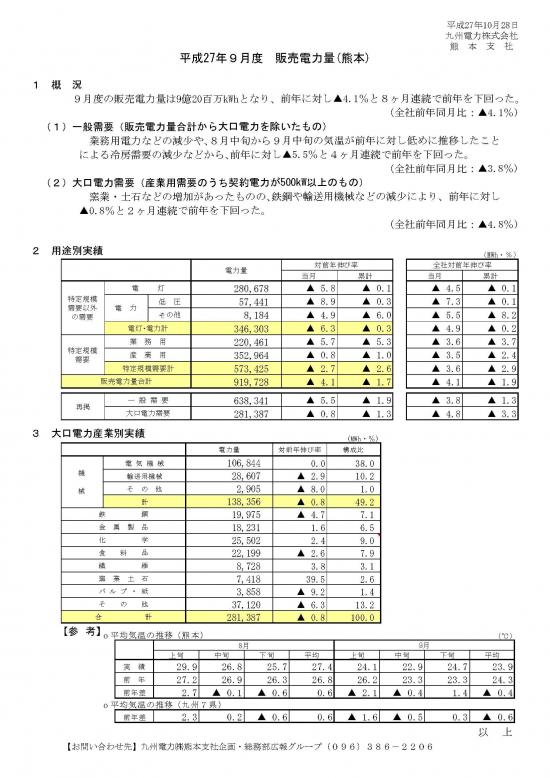 平成27年9月度 販売電力量(熊本)について