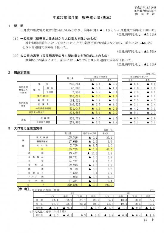 平成27年10月度 販売電力量(熊本)について