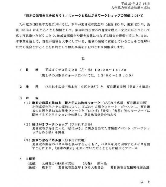 「熊本の漱石先生を知ろう!」ウォーク&絵はがきワークショップの開催について(印刷用)(13KB; PDFファイル) |