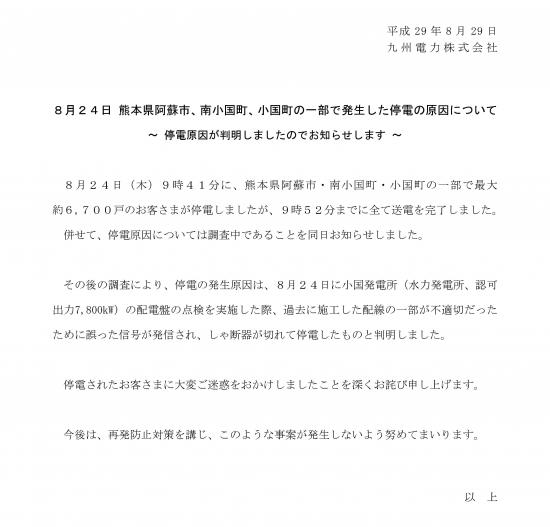 「8月24日 熊本県阿蘇市、南小国町、小国町の一部で発生した停電の原因について」(110KB; PDFファイル) |
