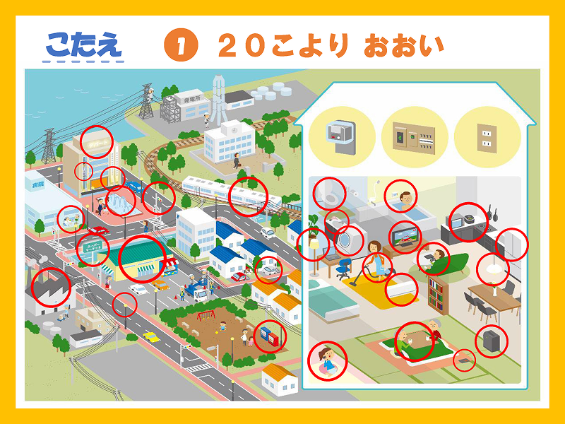 家の中では、冷蔵庫やテレビ、エアコン、ゲームなど、家の外では、信号機や電車、エレベーターなど、たくさんのものに電気が使われています。