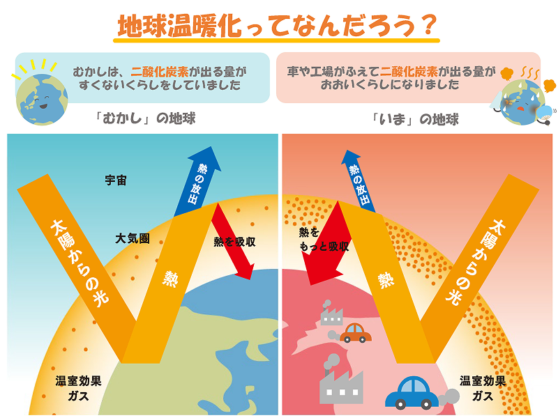 でも今は、私たちが車を運転したり、工場で物を作ったりして二酸化炭素がたくさん出ることで、毛布みたいに地球を包んで、太陽からの熱を中に閉じ込めてしまいます。