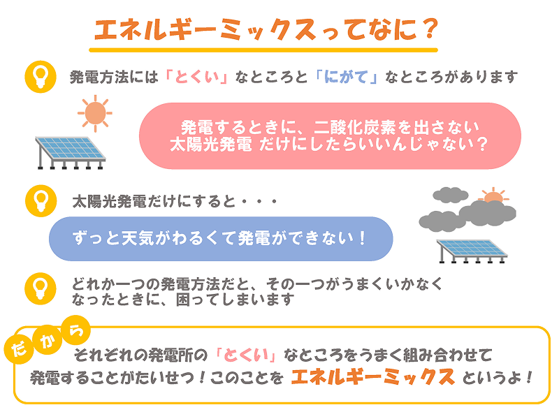 このように、どれか一つの発電方法だけに頼っていると、その一つがうまくいかなくなったときに困ってしまうんですね。
