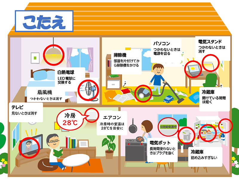 熱中症にならないように冷房を入れるなど、身体に無理することなく、必要な電気はきちんと使いながら、電気を無駄にしないために、使っていないライトやテレビの電源を切ったり、冷蔵庫の使い方を工夫するなどして、大切に使い続けることが重要です。