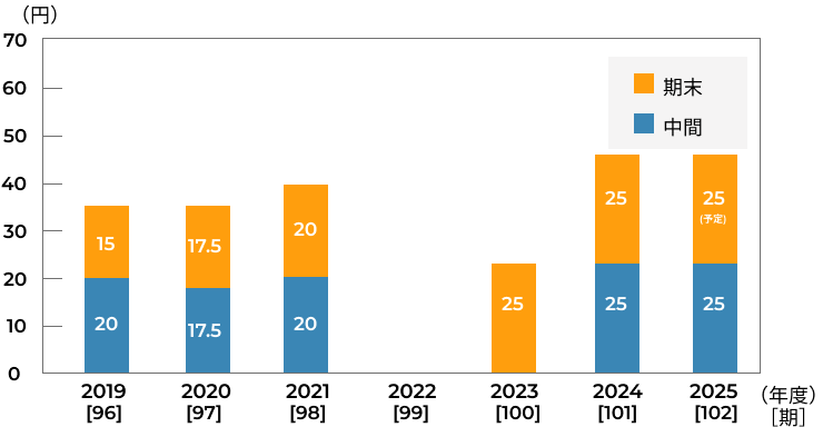 第102期(2025年4月1日から2026年3月31日まで)の中間配当につきましては、当期の業績や中長期的な収支・財務状況などを総合的に勘案し、普通株式1株につき25円、B種優先株式1株につき1,450,000円の配当を実施いたします。