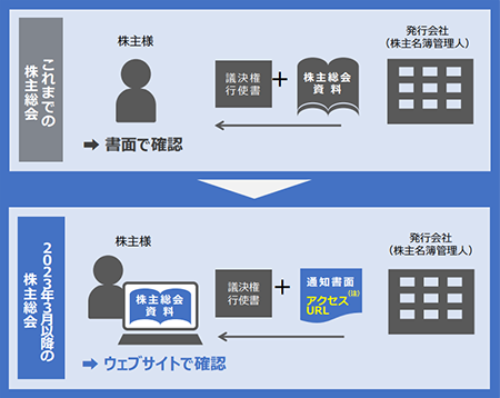 これまでは、株主さまに対して招集通知をご郵送しておりましたが、本制度により、総会日時・場所・議案内容・株主総会資料が掲載されているウェブサイトのURLなどを記載した通知書面のご郵送をもって招集通知とすることができます。