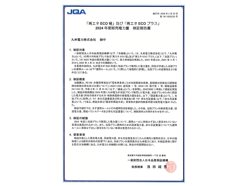 当社が、法人お客さまの環境経営への取組み支援を目的に提供している料金プラン「再エネECO極」および「再エネECOプラス」のより一層の信頼性を高めるため、2024年度の販売実績について、このたび一般財団法人日本品質保証機構(以下、JQAという)による検証手続きを受け、運用ルールに基づき適正であるとの見解をいただきましたのでお知らせいたします。