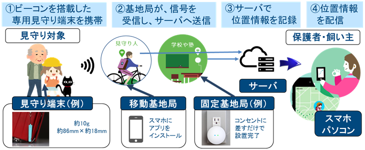 本実験では、ビーコン(電波発信機)を搭載した専用見守り端末を携帯する小学生や高齢者などの位置情報を、保護者などがスマートフォンやパソコンで確認することができるサービスを提供します。これによって、IoT技術を活用した「見守りサービス」の有用性について検証します。