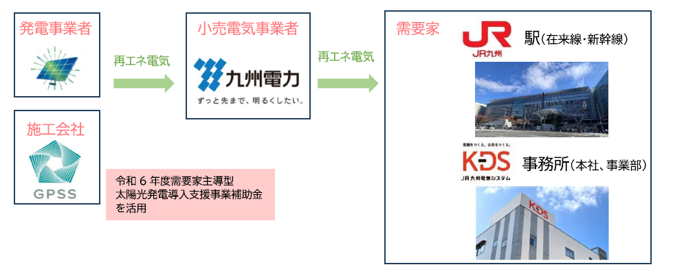 九州旅客鉄道株式会社(代表取締役社長執行役員:古宮洋二 以下、JR九州)、JR九州電気システム株式会社(代表取締役社長:大石和弘 以下、KDS)、九州電力株式会社(代表取締役社長執行役員:西山勝 以下、九州電力)、GPSSホールディングス株式会社(代表取締役:目﨑雅昭 以下、GPSS)は、オフサイトPPA(注)により、JR九州グループの駅や事務所等への再生可能エネルギー100%由来の電気(以下、再エネ電気)の供給を4者共同で行う契約を、2025年11月1日、締結いたしました。