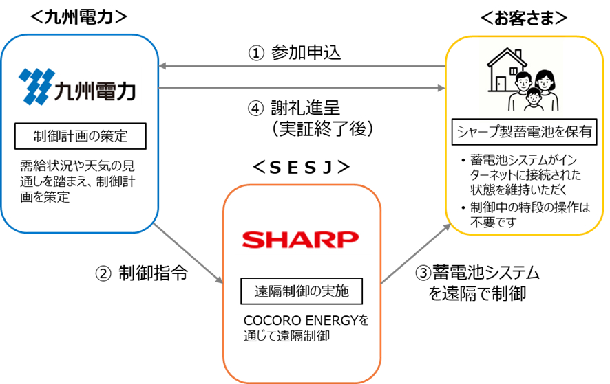 本実証は、SESJが運用するサービス「COCORO ENERGY(注3)」の仕組みを活用し、シャープ株式会社(以下、シャープ)製の家庭用蓄電池を、太陽光発電が多く稼働する昼間に充電、電力需給が厳しくなる夕方等に放電するよう遠隔制御することにより、九州エリアにおける再エネ有効活用の可能性を検証します。