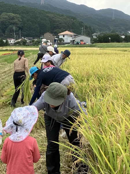 5月に田んぼに植えた稲が首(こうべ)を垂れるほど大きく育ち、9月下旬には収穫時期を迎えました。少し暑さを感じる中、田植えに参加した方やオイスカさまの海外研修生など総勢160名が稲刈りを行いました。慣れない鎌に苦戦しながらも、大きく実ったたくさんの稲を一つひとつ刈り取り、1時間程度で作業を終えることができました。参加した子どもたちは、たんぼにいるとんぼやバッタ、かえるなどの生きものたちと触れ合いながら、稲刈りを楽しんでいました。