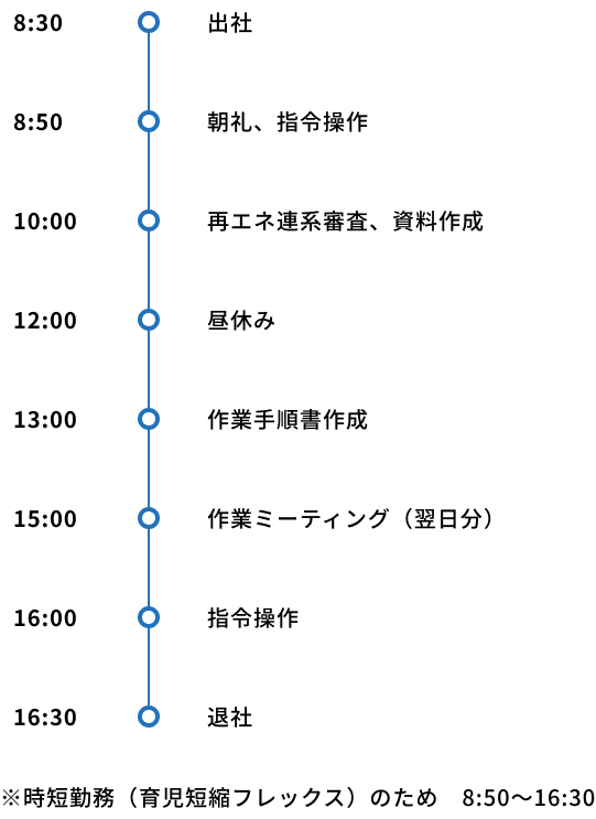 また日々の工事計画管理に加え、再生可能エネルギー関連の業務を担っています。お客さまの設備の確認と同時に、当社設備が容量などの条件を満たしているか技術計算をして、再エネ発電事業者さまが配電線に連系できるかどうかの審査を行います。