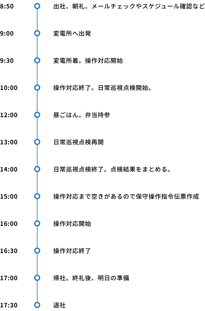 社会人になった当初は、学生時代に頭の中で理解していた理論が「ああ、こうだったんだ」と腑に落ちる体験の連続でした。その一方で、実際に社会で動いている電気の仕組みは、勉強してきたことよりもずっと複雑だったと気づかされてもいます。それを実感できる立場にあって、やりがいも感じています。