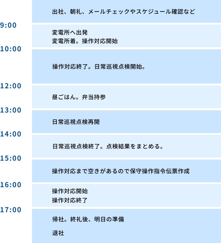 変電所の保守業務として、巡視点検をおこなっています。また作業に伴い電気を止める必要がある箇所の停電操作や、設備に障害が発生した時の初動対応もおこなっています。