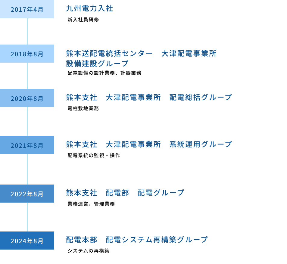 電柱や電線の新設・取替など、電気設備の建設工事を行う際には、委託先の工事業者の方がたが安心・安全に作業に従事できるよう、電力系統の操作を確実に行う必要があります。系統操作を行うことでお客さまの電気を止めることなく安全に工事を進めることができるのですが、一方で、私の判断ひとつで停電やヒューマンエラーなどの大きな影響を及ぼす可能性があります。そのため、緊張感を持って業務を行い、無事にその日の作業が完了した時には大きなやりがいを感じました。「安全第一」で工事が終わることが一番大切だと実感しています。