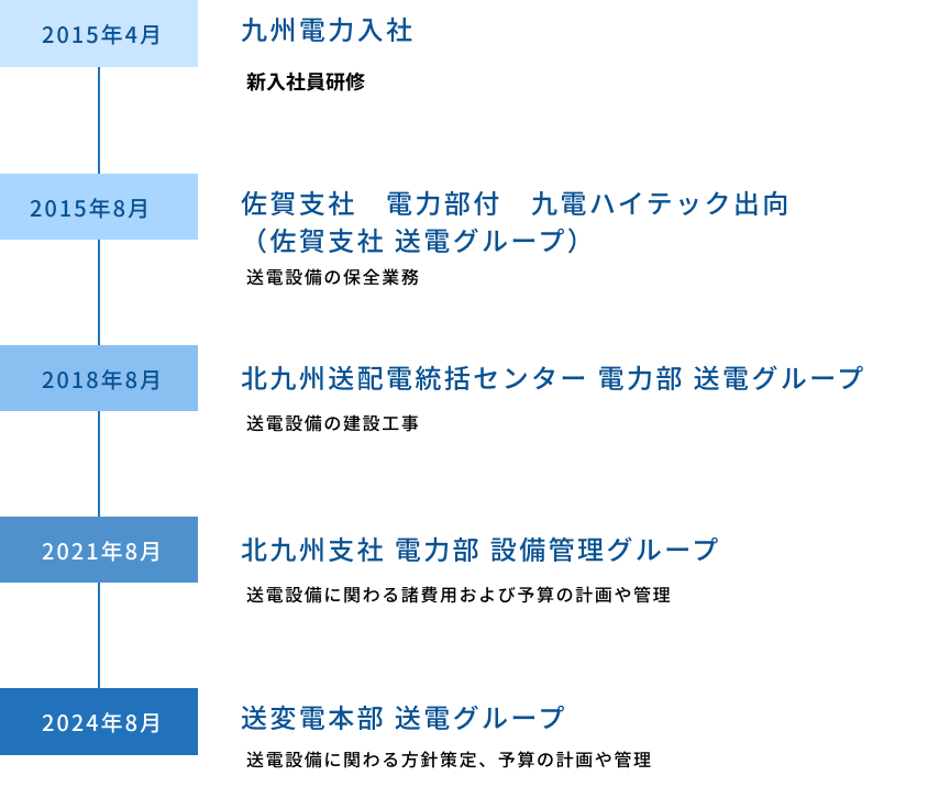 私は高専の卒業生なのですが、当初は介護ロボットを作るような分野で社会貢献したいと考えていました。しかし就職活動を行う際、先生から「電気は人の生活の基本になるもので、九州の人のみんなの役に立てるよ」と、九州電力を薦めていただきました。