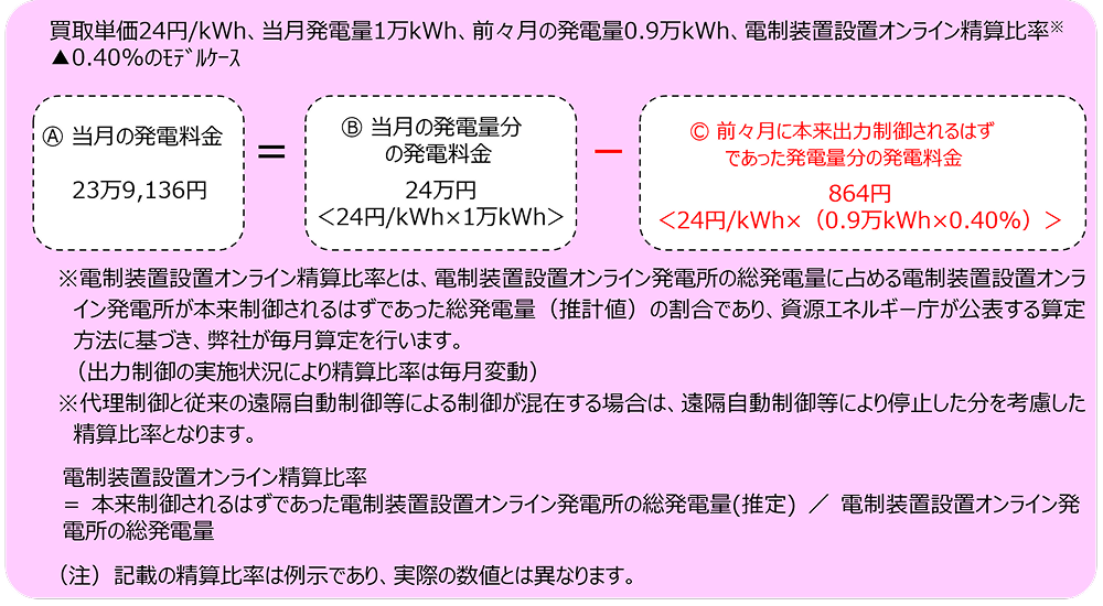 なお、電制装置設置オンライン発電所のうち風力発電所については、オンライン代理制御の対象外であるため、原則、関門連系線の運用容量に影響しないように出力制御で対応いたします。 - 代理制御が行われた場合は、発電停止に伴う発電量の減少はありませんが、オンライン発電所が代理で実施した分の精算として、「本来出力制御されるはずであった時間帯の発電量(代理制御調整電力量)にFIT買取単価を乗じた金額」を2か月後の発電料金から控除します。(実際の発電量よりも発電料金は減少)