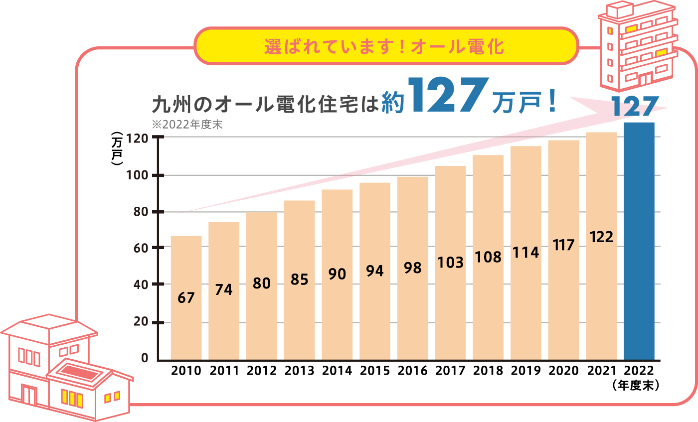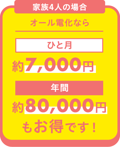 〈4⼈家族の場合〉●オール電化住宅:給湯/エコキュート、調理/IHクッキングヒーター●電気・ガス併⽤住宅:給湯/エコジョーズ、調理/ガスコンロ[電気料⾦]●2024年5⽉1⽇時点で九州域内対象のオール電化向け料⾦メニューを有する⼩売電気事業者6社の平均単価●消費税等相当額、再⽣可能エネルギー発電促進賦課⾦、燃料費等調整額(電源調達調整費等)を含む[ガス料⾦]●⻄部ガス家庭⽤⾼効率給湯器契約45MJ地区●消費税等相当額、原料費調整額を含む [試算条件]●2024年5⽉分の料⾦単価により算出●国の電気・ガス価格激変緩和対策事業による割引は含まない ●オール電化:契約容量6kW電力量610kWh/月(昼間305kWh夜間305kWh)●電気・ガス併用:電気 契約電流40A 電力量420kWh/月、ガス 料金表C 使用量41m3/月(給湯35m3+調理6m3)※光熱費のみの比較であり、初期費用及び機器本体の買替費用は別途必要 ※この内容は、あくまでも試算条件に基づいたものであり、実際の光熱費は地域・機器効率・使用状況等により異なる