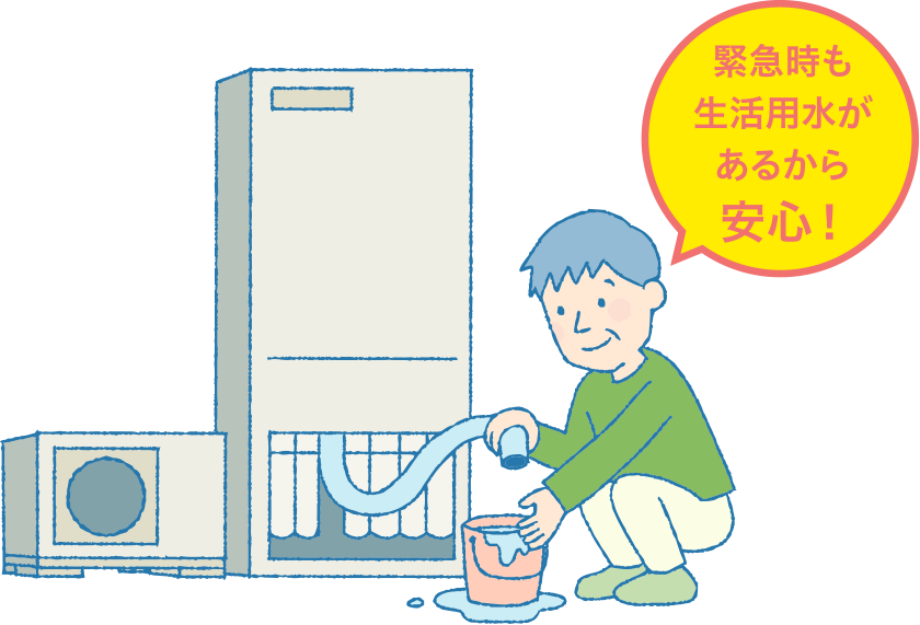 エコキュートのタンク内の水は、災害などの断水時には非常用の生活用水として利用可能※です。貯湯タンク370Lの場合、4人家族3日分相当を生活用水として利用できます。(飲料水としてはお勧めしません)