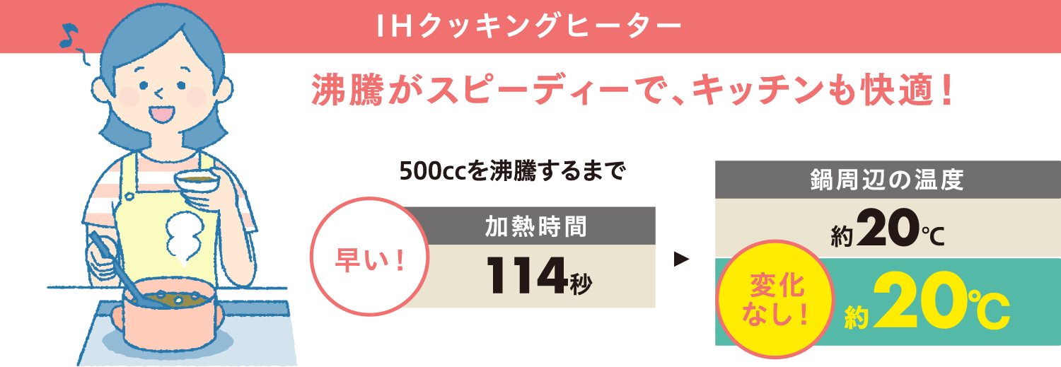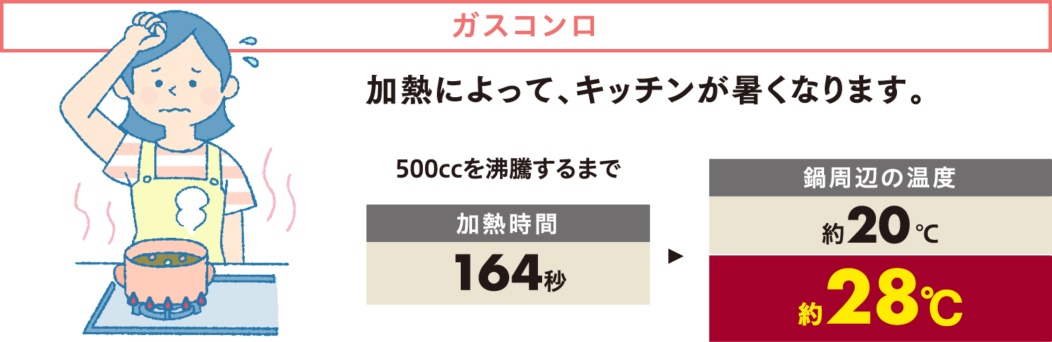 ※約19℃の水500ccを90℃に加熱したときの沸騰するまでの時間と周辺温度(鍋の横約10cm)の変化を表示しています。(当社実測値)