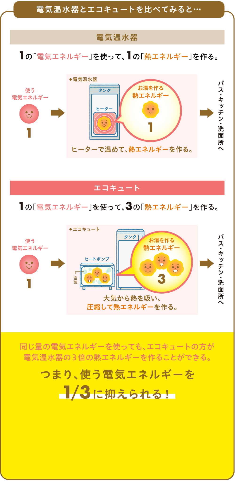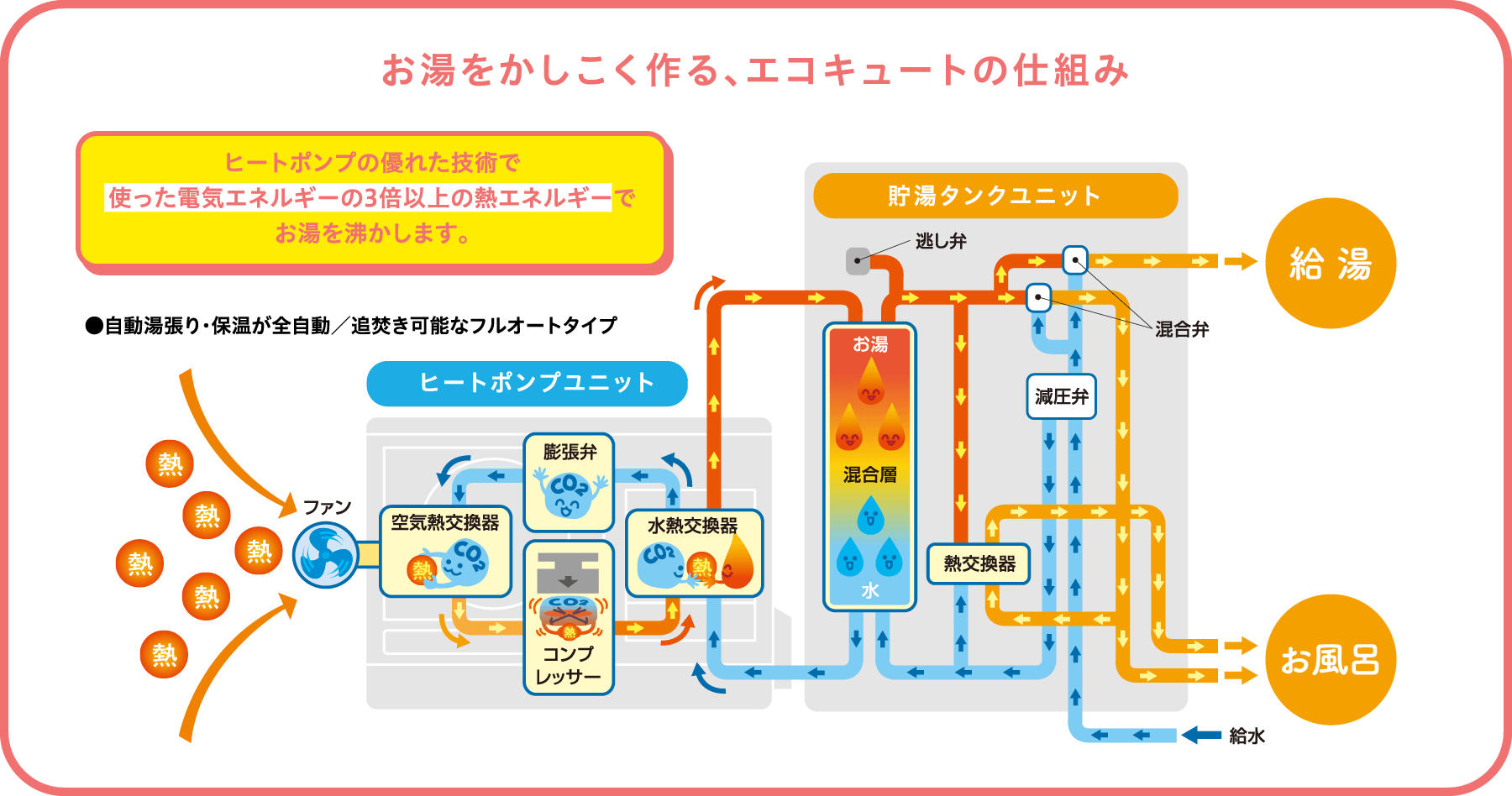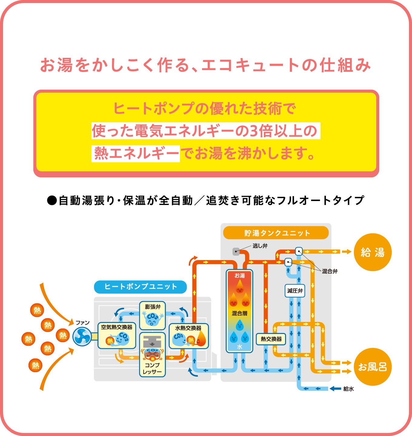 エコキュートは、空気の熱を取り込んで、効率的にお湯を沸かします。